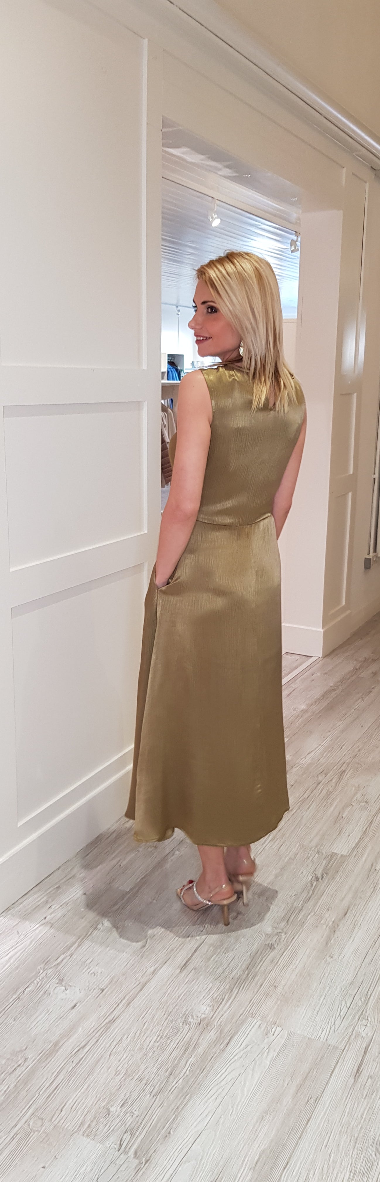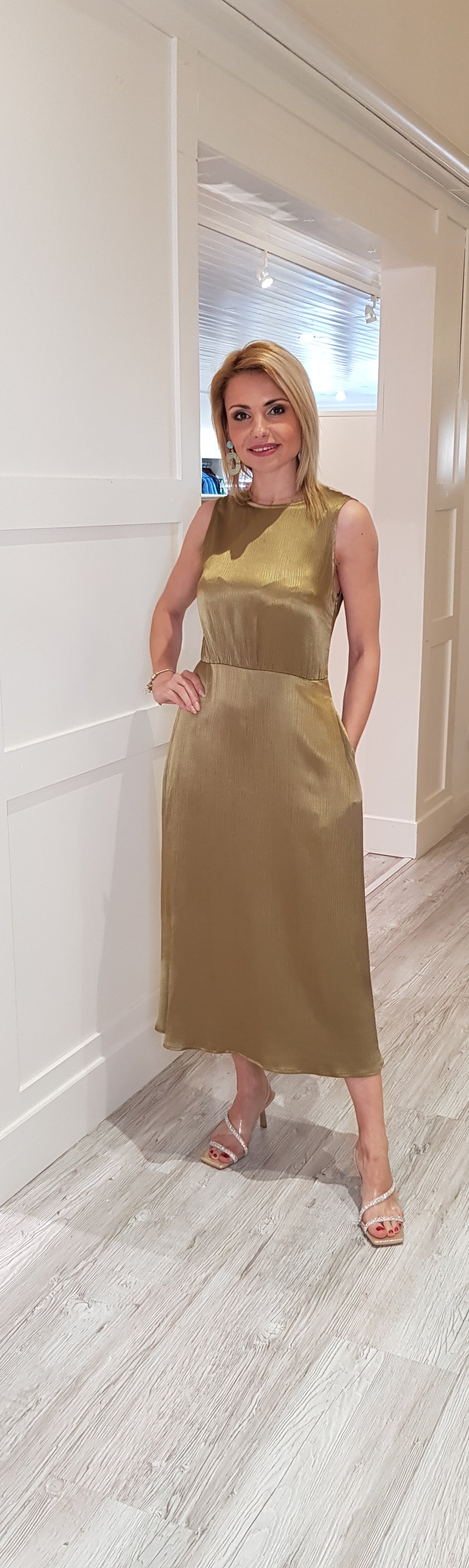Olive Green Satin Look Midi Dress