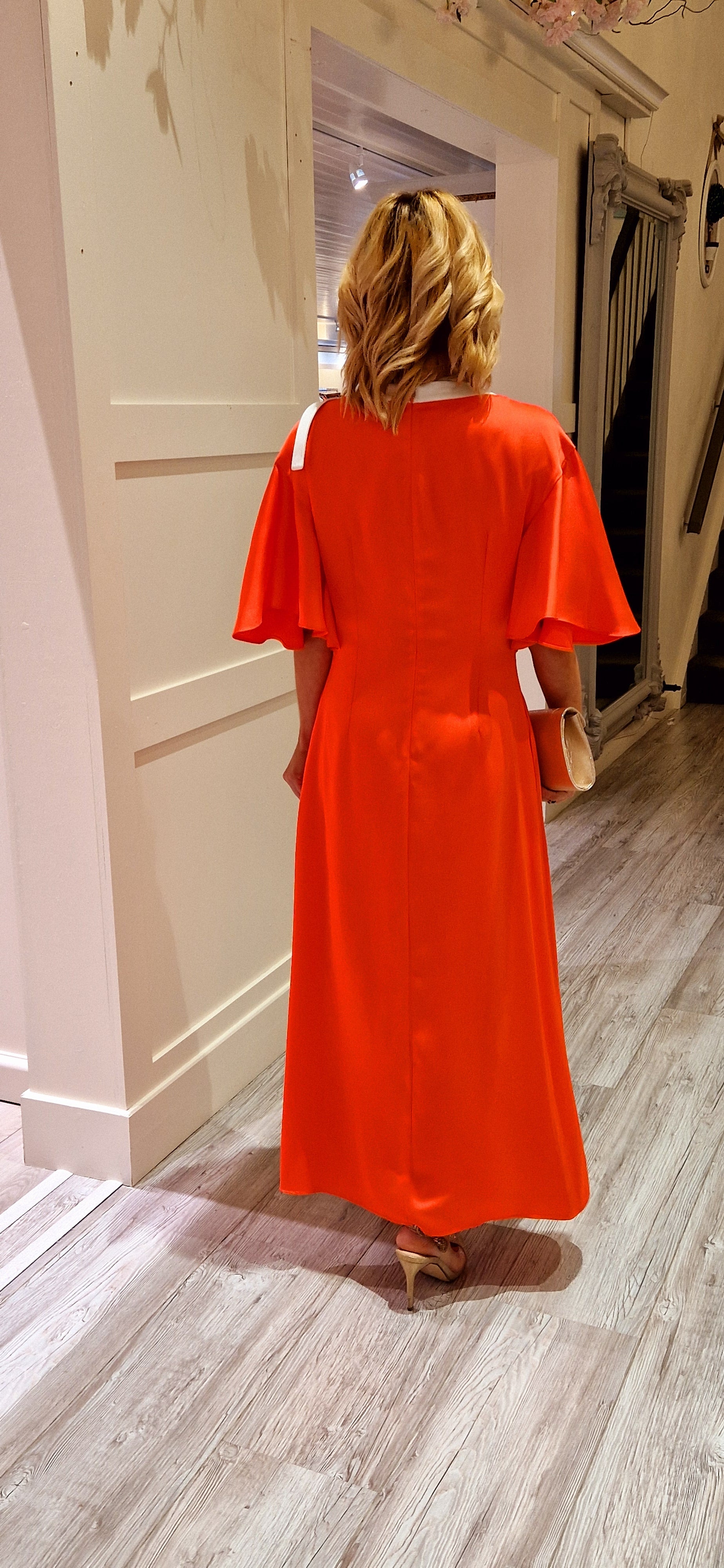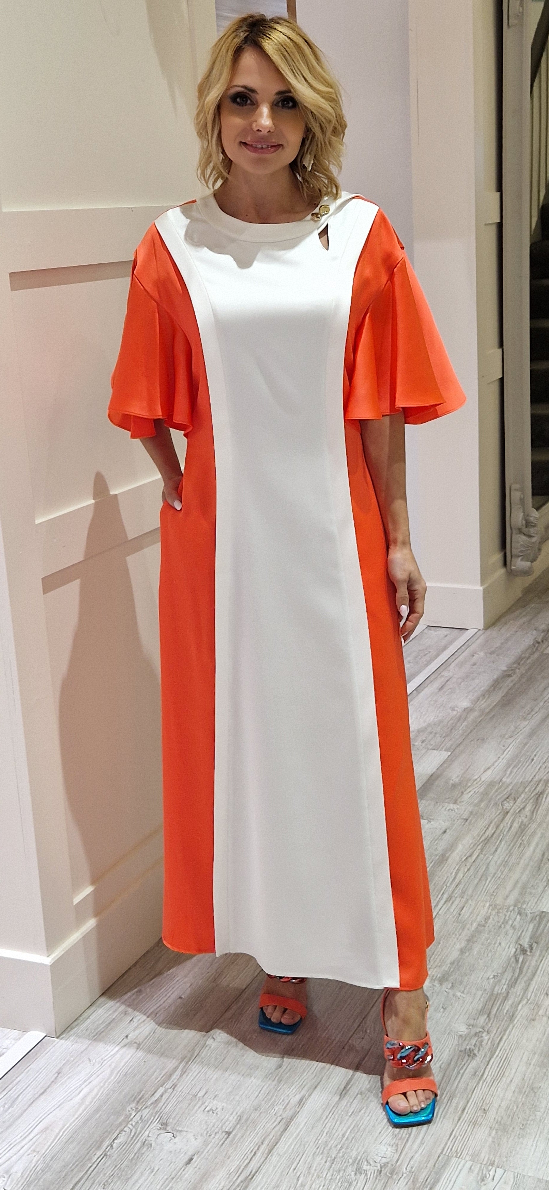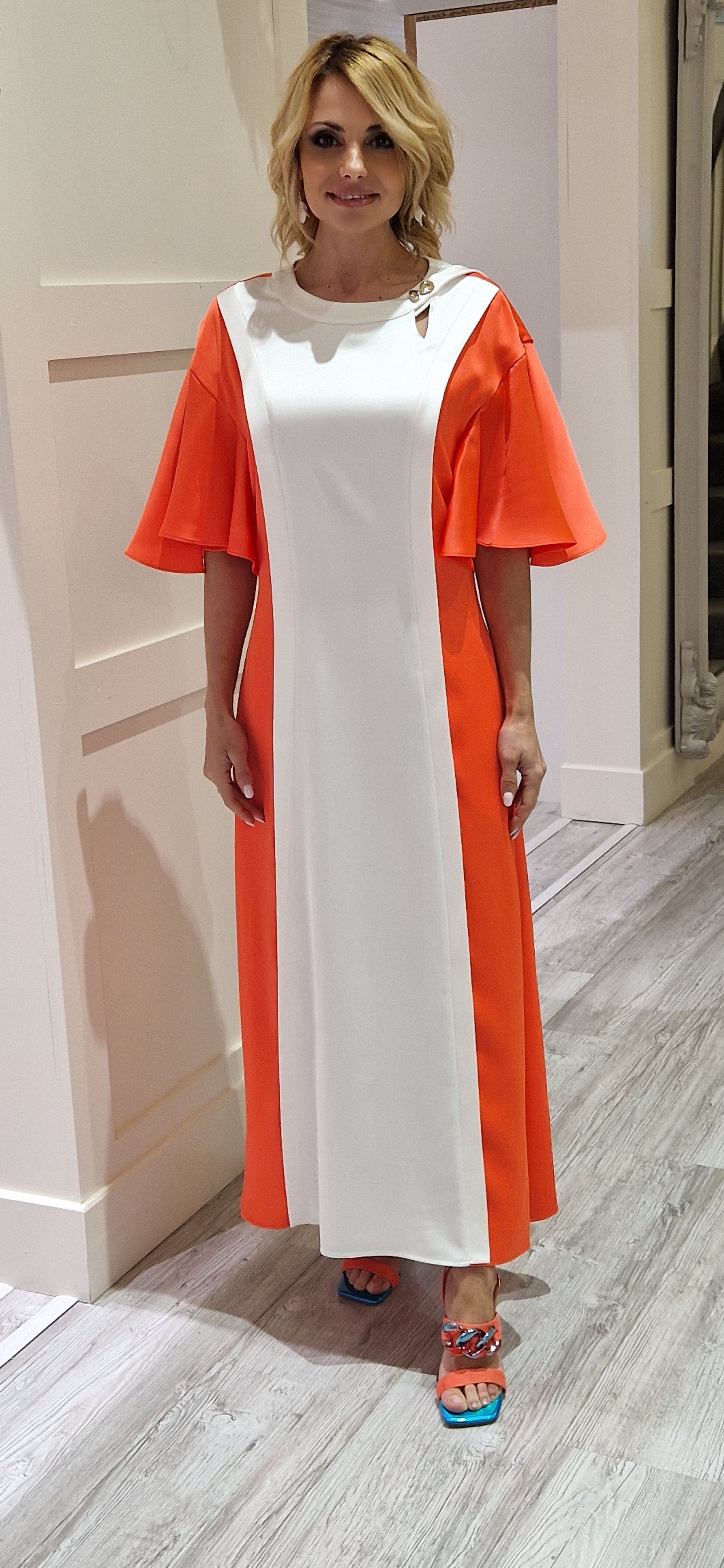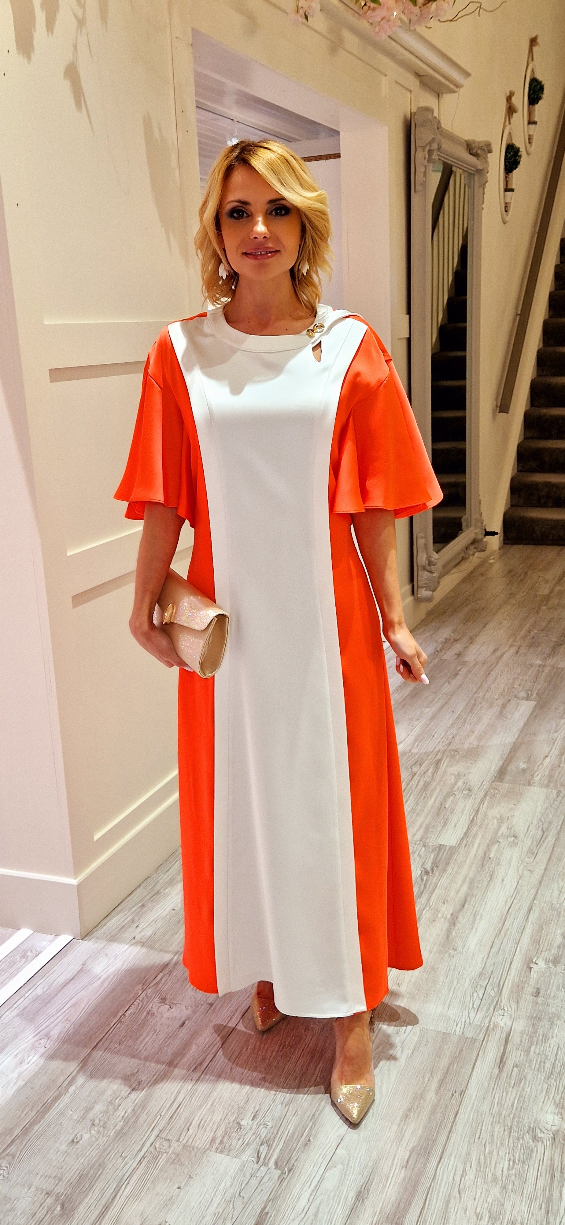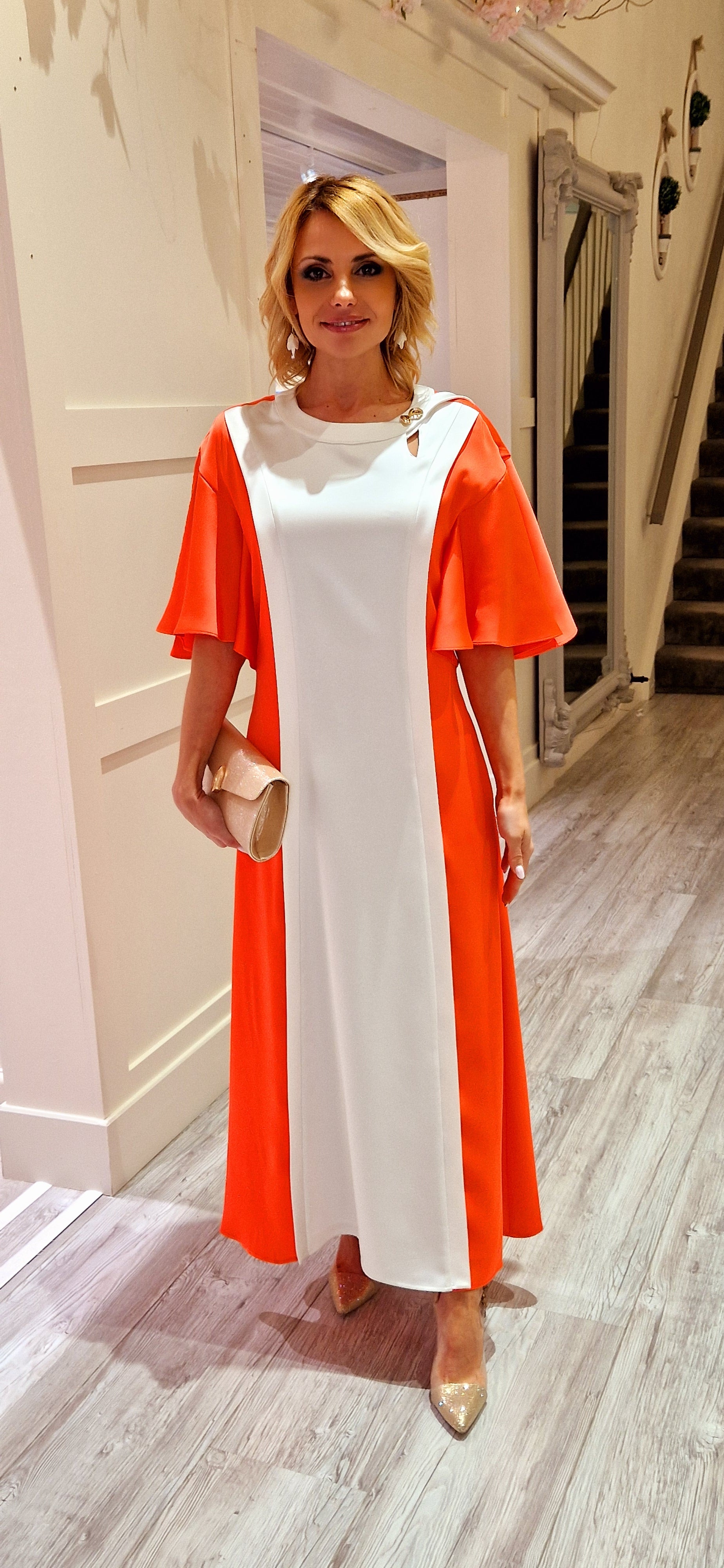 Expertly crafted from soft, luxurious fabric, our Orange And Cream Midi Dress offers a beautiful, comfortable fit. The round neck is accented with elegant gold buttons, while the fluted sleeves add a touch of sophistication. Fully lined and made from 100% polyester for lasting quality. Transform your wardrobe with this stunning midi dress.