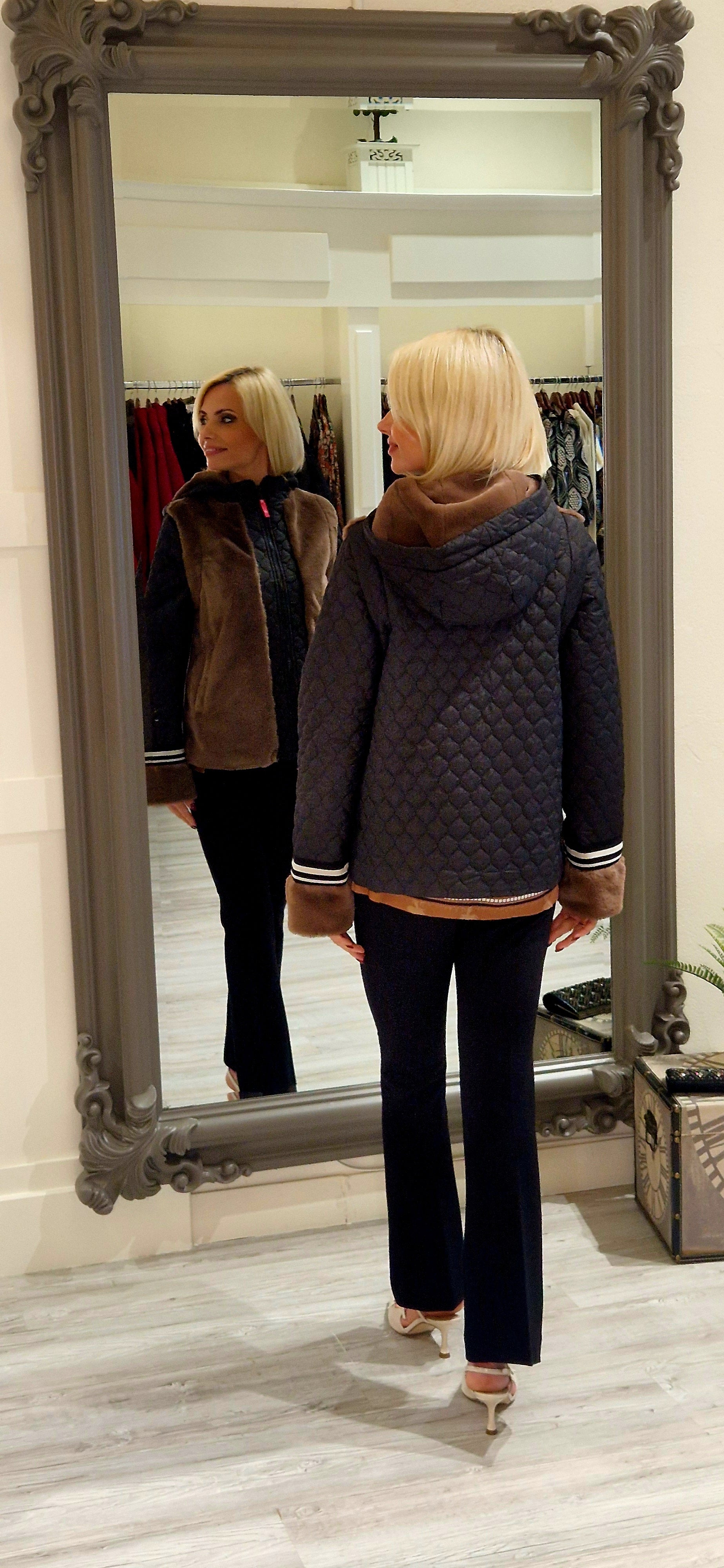 Black and brown jacket featuring a diamond-pattern quilted body with a soft faux fur front panel. Its 2-in-1 design allows the sleeves to be removed and easily converted into a vest. With an integrated hood, sporty striped cuffs, and a fuchsia zip puller, it's a versatile and warm piece for a stylish urban look.