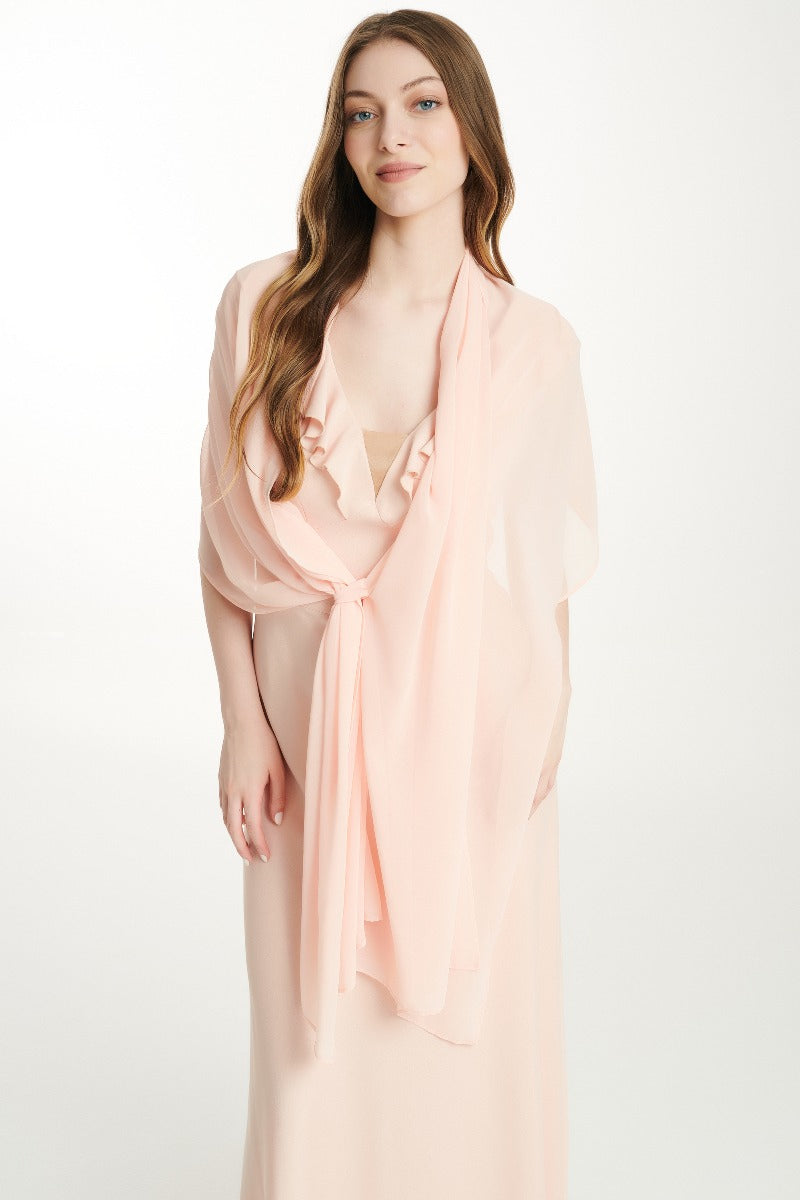 This Peach Chiffon Cape is the perfect accessory to elevate any outfit. Made of high-quality chiffon material, it offers a luxurious touch while keeping you warm and stylish. The small loop design ensures a better and comfortable fit. Complete your look with this lovely cape.