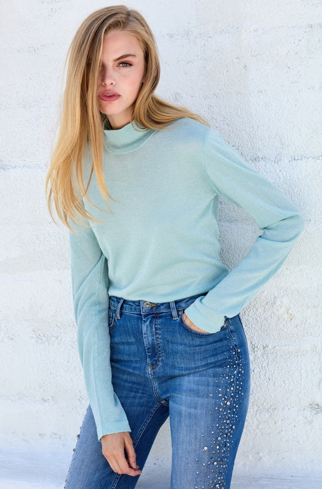 As an industry expert, our Peppermint Knit Top offers a wool blend with glittering lurex that provides warmth and sparkle. The regular fit and ribbed stand-up collar with zipper make for a comfortable yet stylish option for any occasion. Perfect for layering or as an undergarment. Long sleeve with ribbed sleeve and body hem for added comfort.