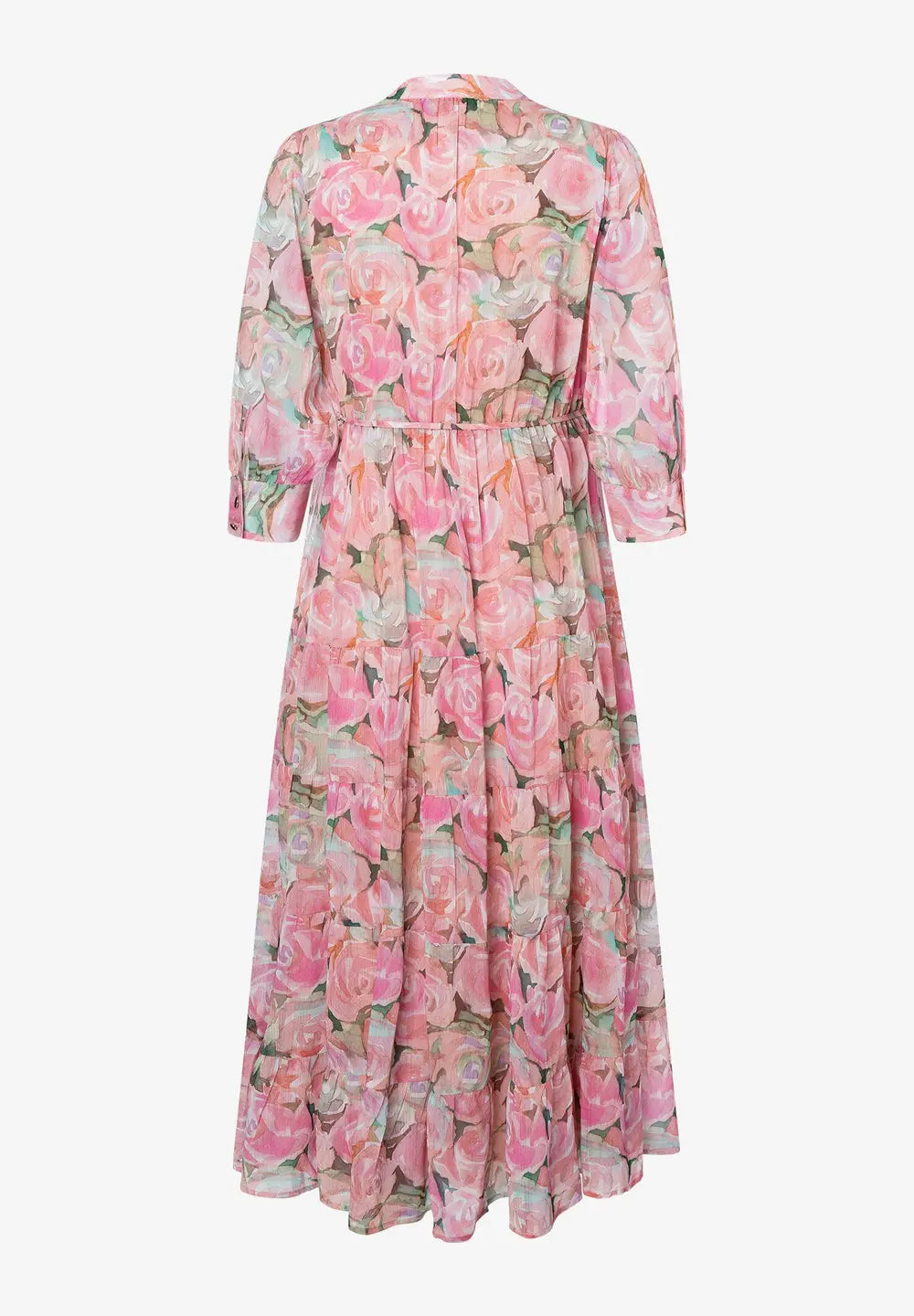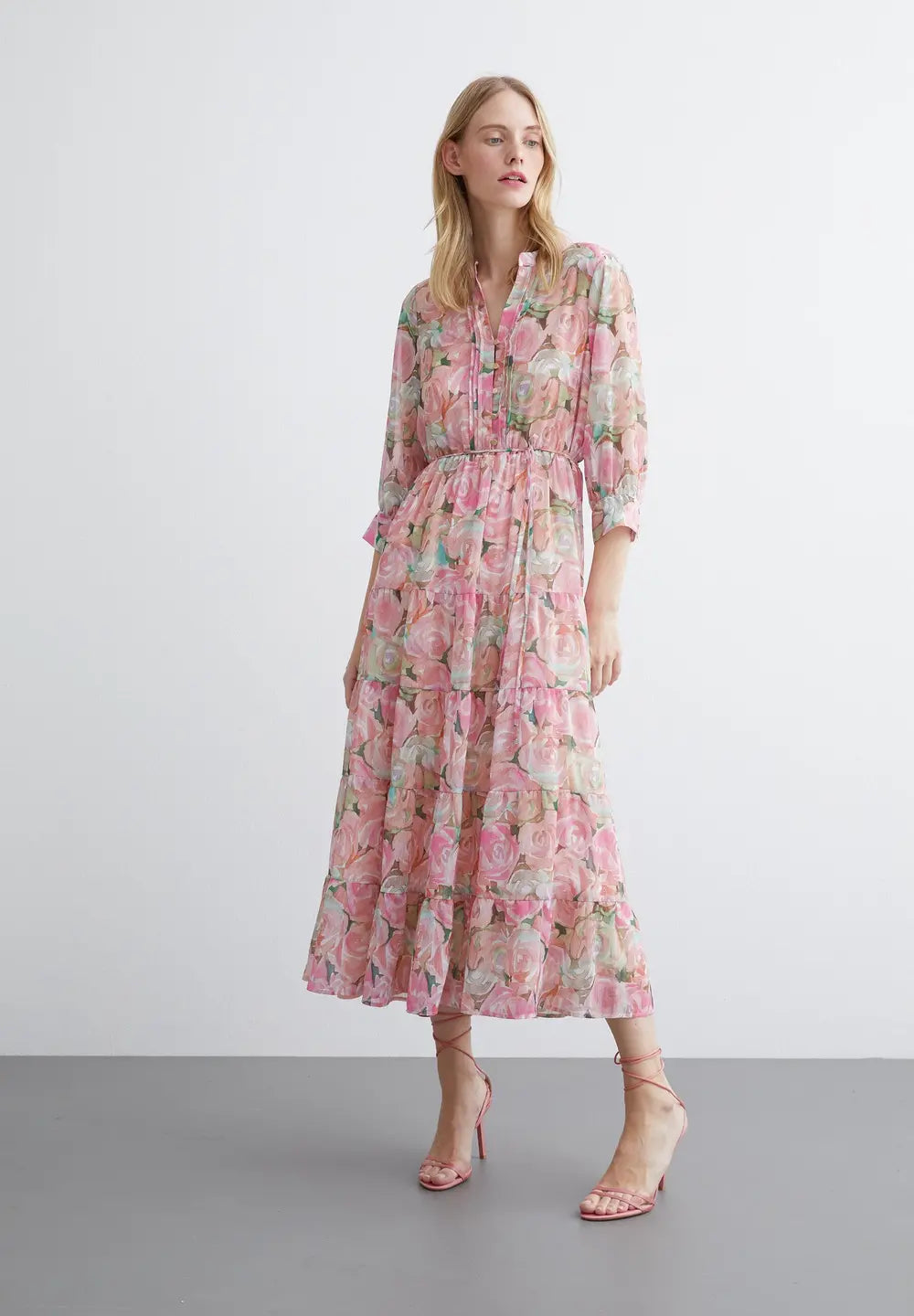 You can style the wonderfully beautiful maxi dress with a delicate rose print in pink/pink/green tones either casually with a denim jacket and sneakers or elegantly with heels and a clutch.
