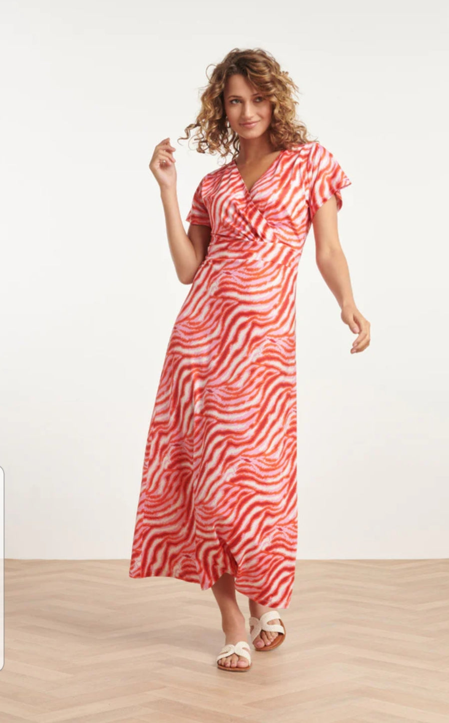 Look effortlessly chic in our Pink/Red Print Maxi Dress. The V-neck, short sleeves, and belt add flattering details to this versatile piece. Made with 95% polyester and 5% spandex, it's comfortable and easy to care for with a 30 degrees wash. Perfect for any occasion, this dress is a must-have for your wardrobe.