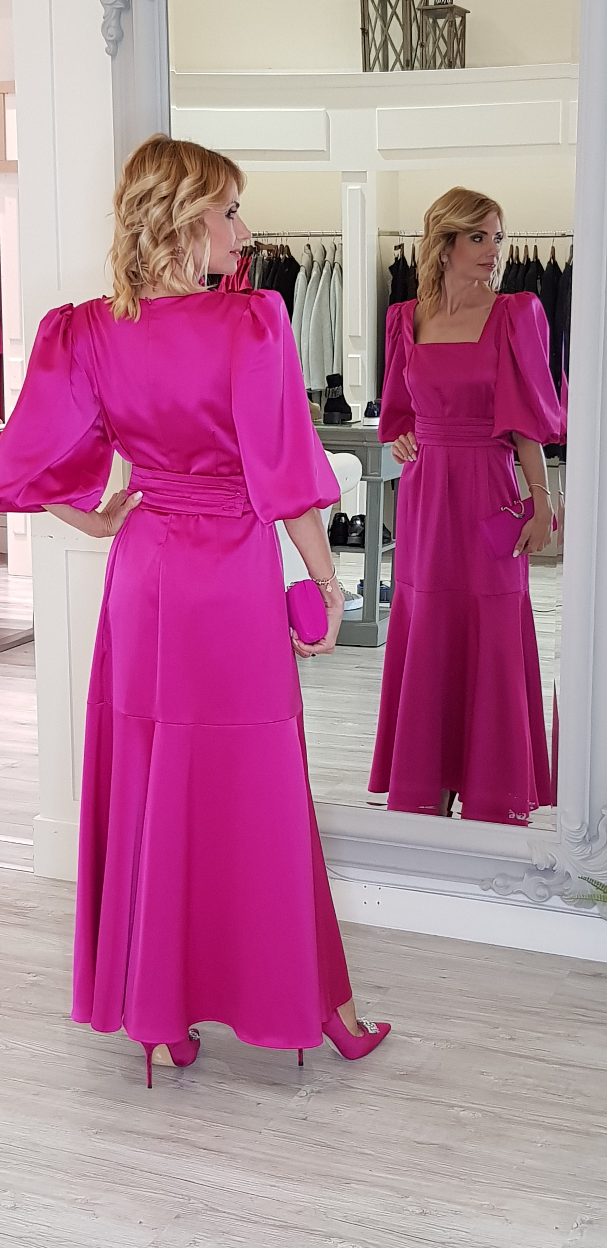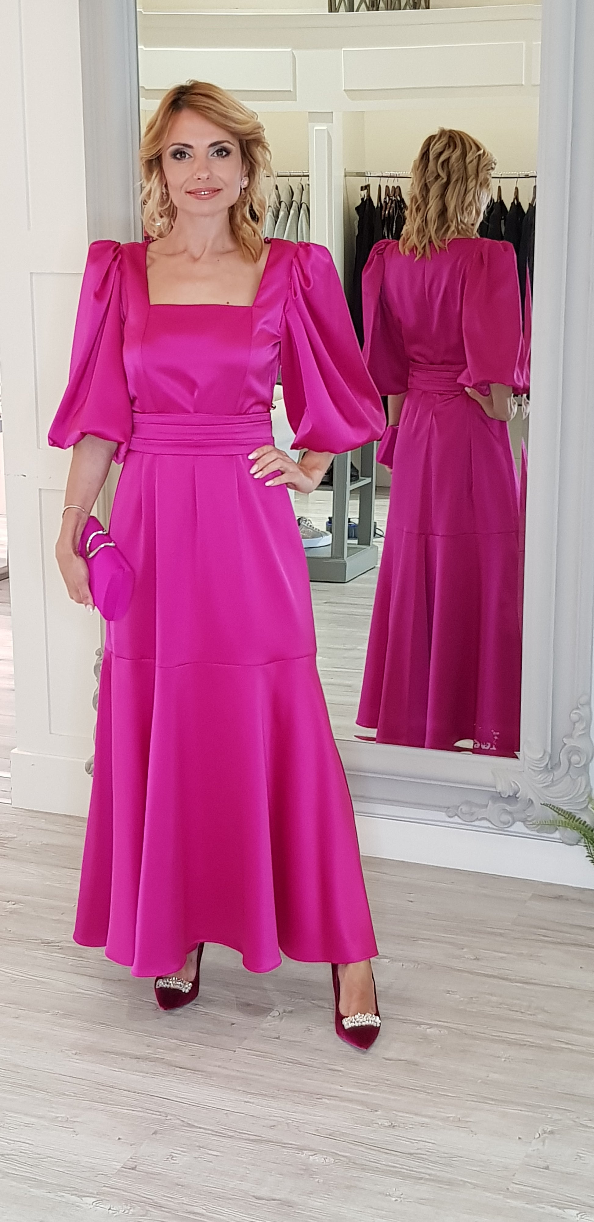 As an industry expert, we present the Pink Satin Maxi Dress. Designed with a square neck and 3/4 cup sleeves, this dress flatters the figure. The detachable belt cinches the waist and the back zipper allows for easy dressing. Made from 100% polyester, this dress is also delicate wash-friendly. Check out our matching shoes and bag for a complete look.