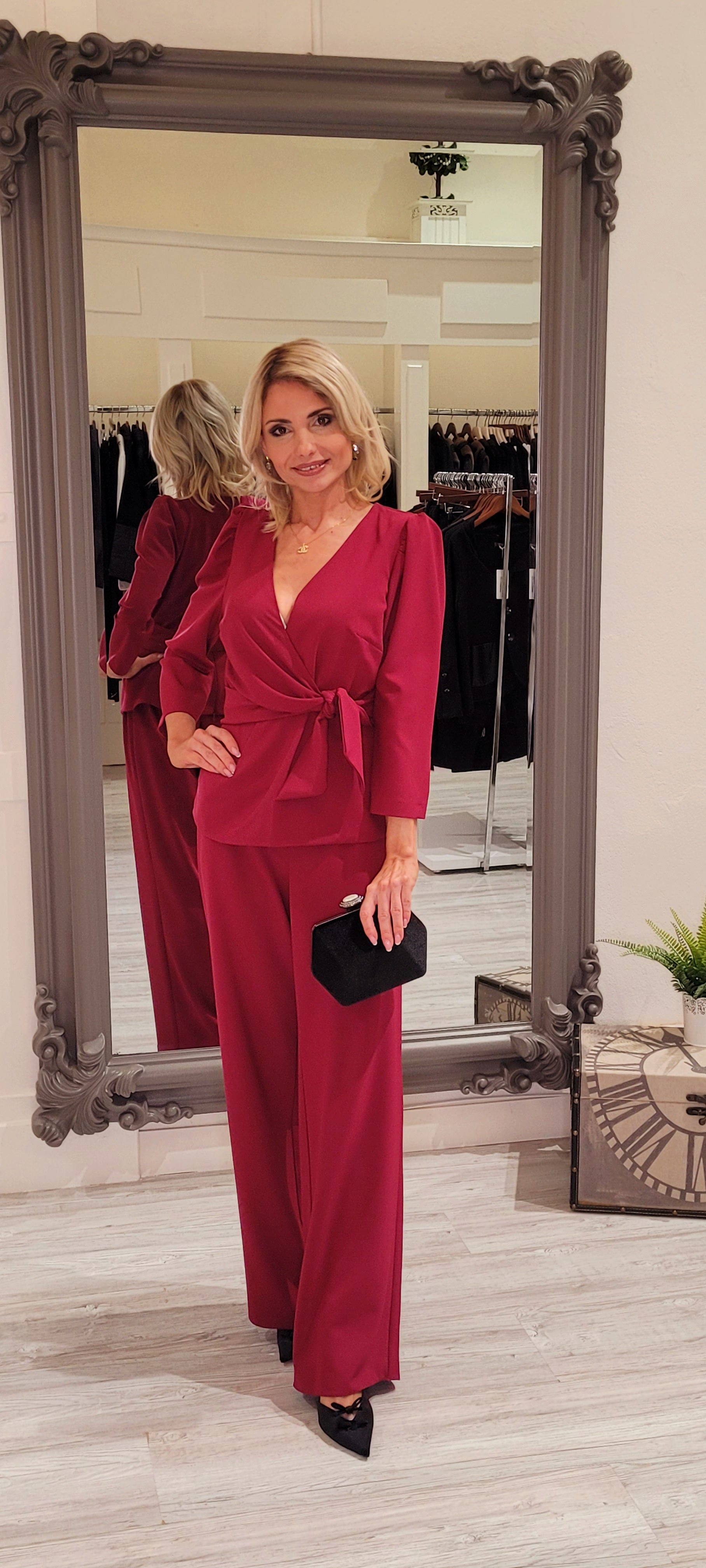 Elevate your wardrobe with this sophisticated plum two-piece suit, expertly crafted for modern elegance. The palazzo trousers feature a discreet back zip closure for a seamless silhouette, while the wrap top showcases three-quarter sleeves and matching back zip fastening. Constructed from 100% polyester with a delicate wash care requirement, this ensemble offers refined style with effortless sophistication. Complete your look with the coordinating bag and coat available to create a cohesive, polished appearance.
