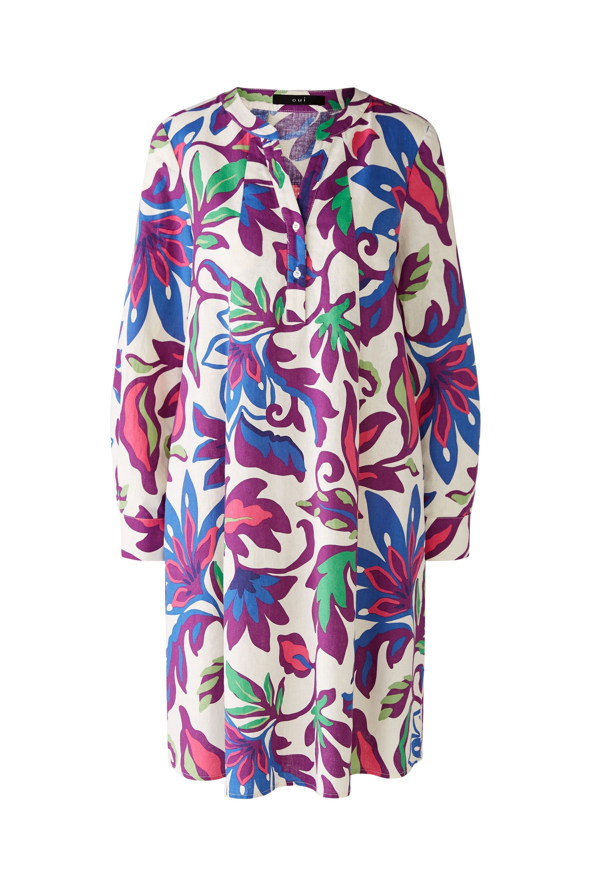 Expertly crafted, this stunning Plume And Green Flower Knee Length Dress features a stand-up neck with front buttons and a long sleeve with button detail on the cuff. The A-line style and two side pockets make it both fashionable and functional. Adorned with a lovely plume and green and blue flower print, it's the perfect dress for any occasion.