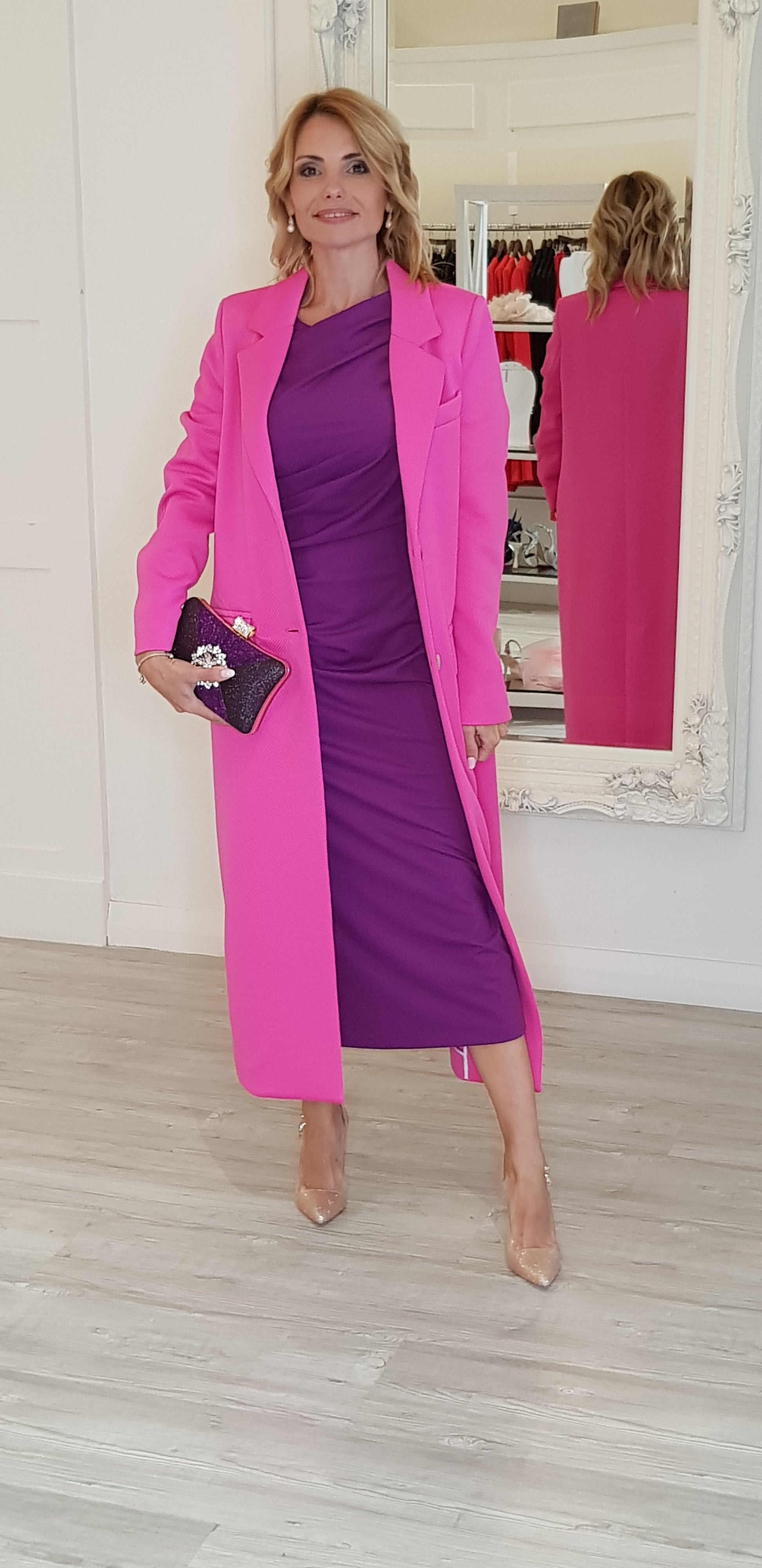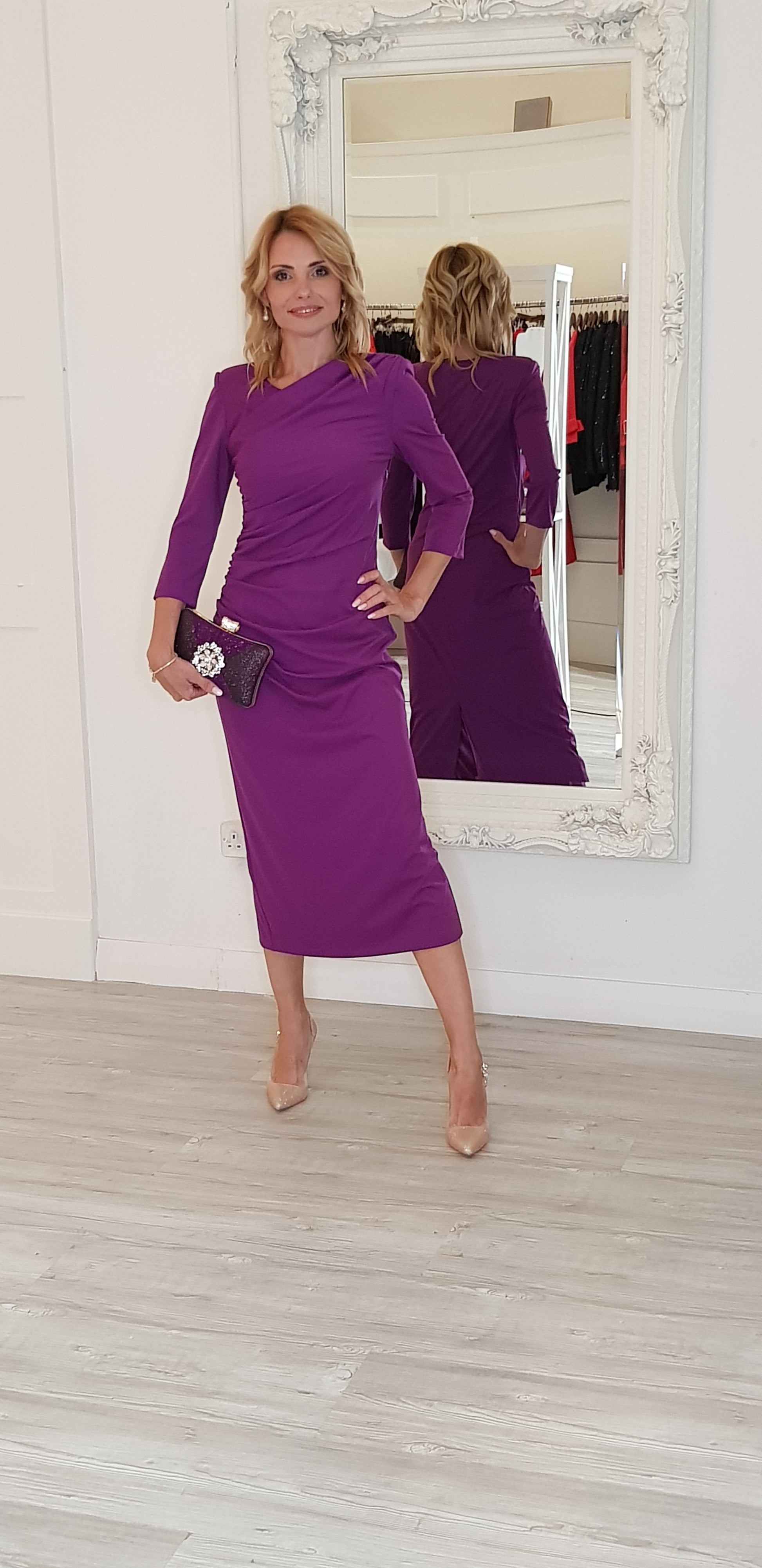 Crafted with a round neck and 3/4 length sleeves, the Plume Fitted Midi Dress offers both style and comfort. The ruched detail on the side adds a flattering touch, while the small slit on the back allows for ease of movement. Complete with a side zip and lined for a sleek finish.
