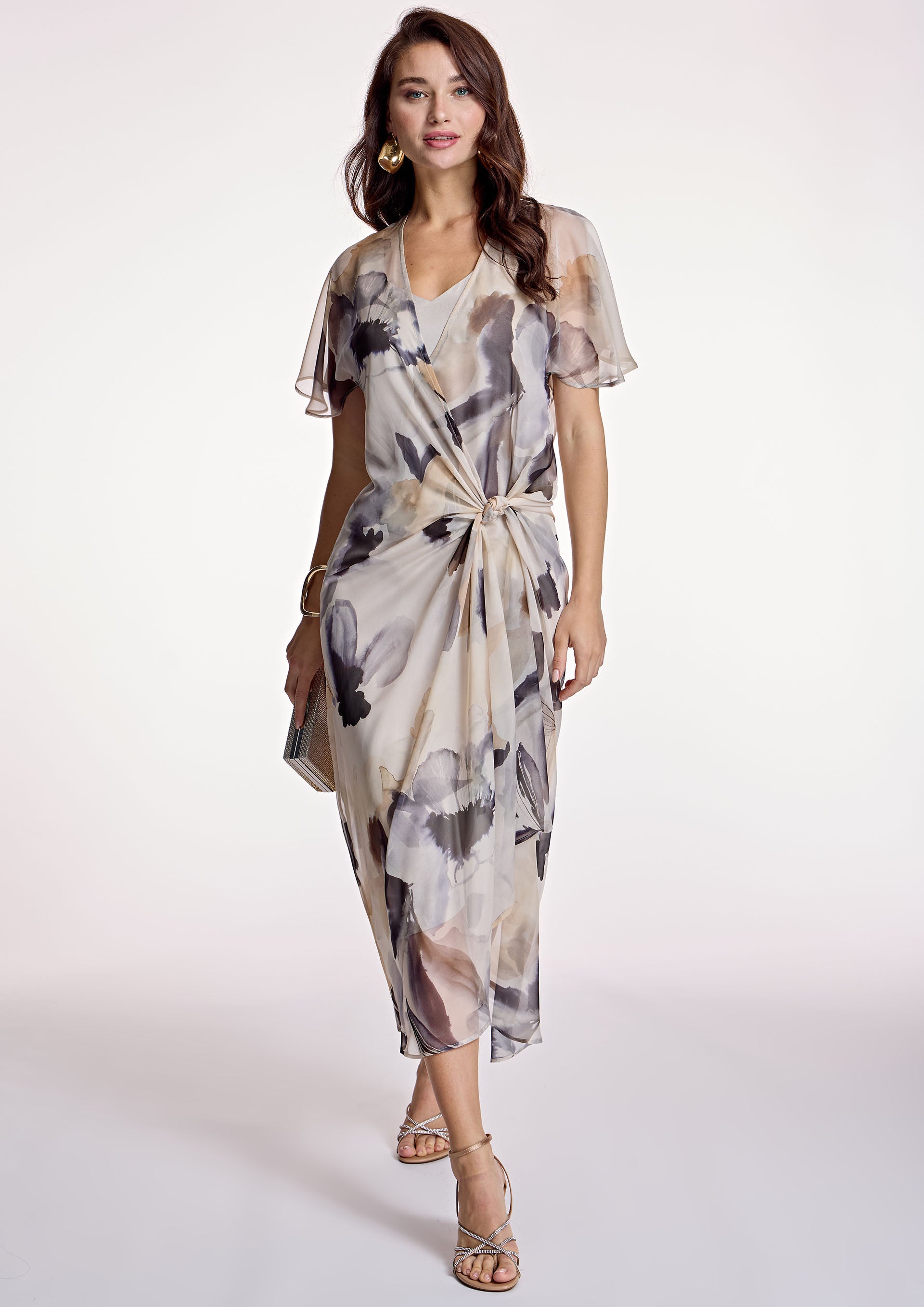 Expertly crafted with delicate polyester material, this Printed Dress With Front Knot is a must-have for any fashion-forward wardrobe. The short silk sleeves add a touch of luxury to the modern print design. Perfect for any occasion, this dress is easy to care for with a delicate wash. Upgrade your style with this versatile and stylish dress.