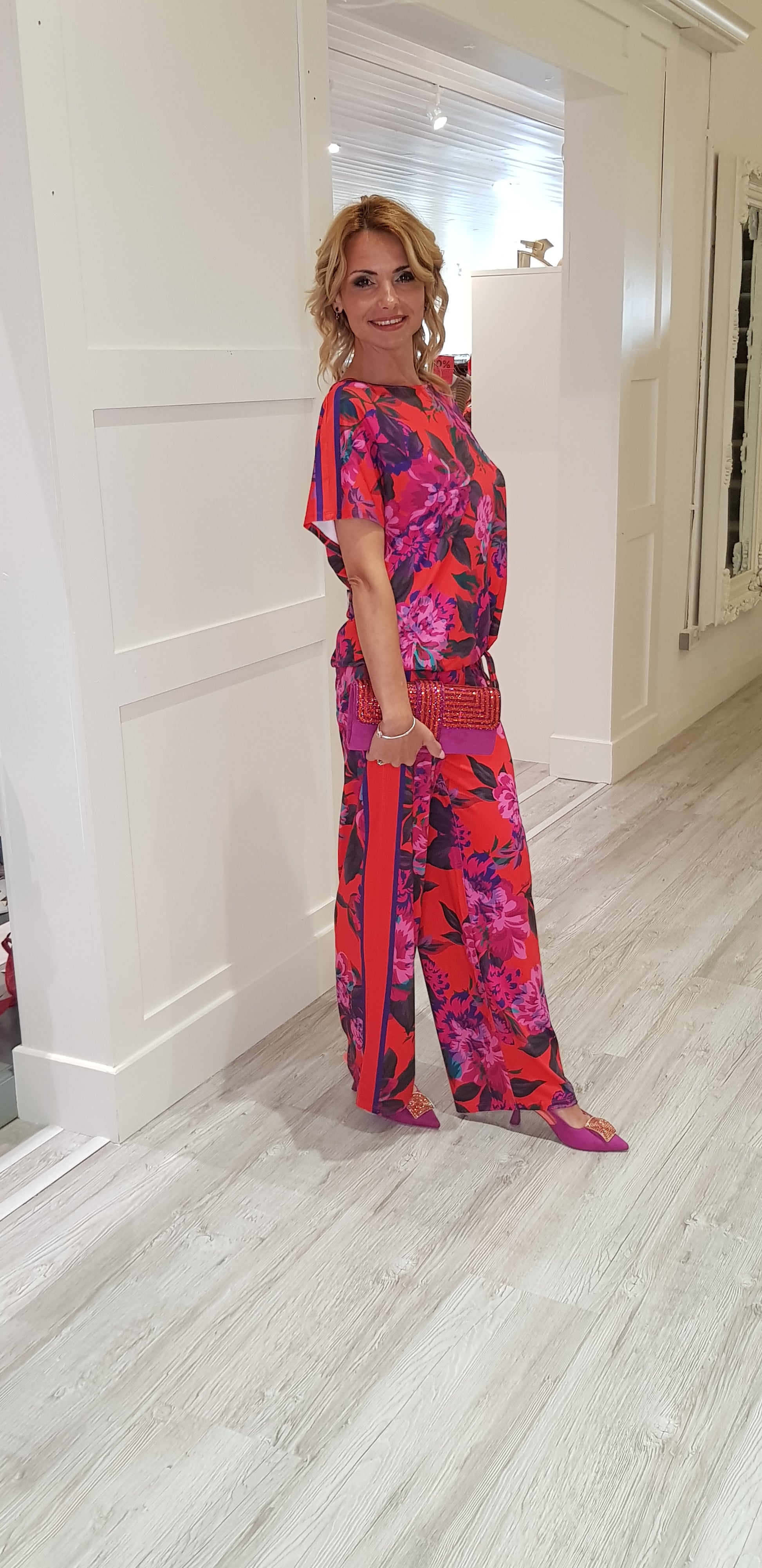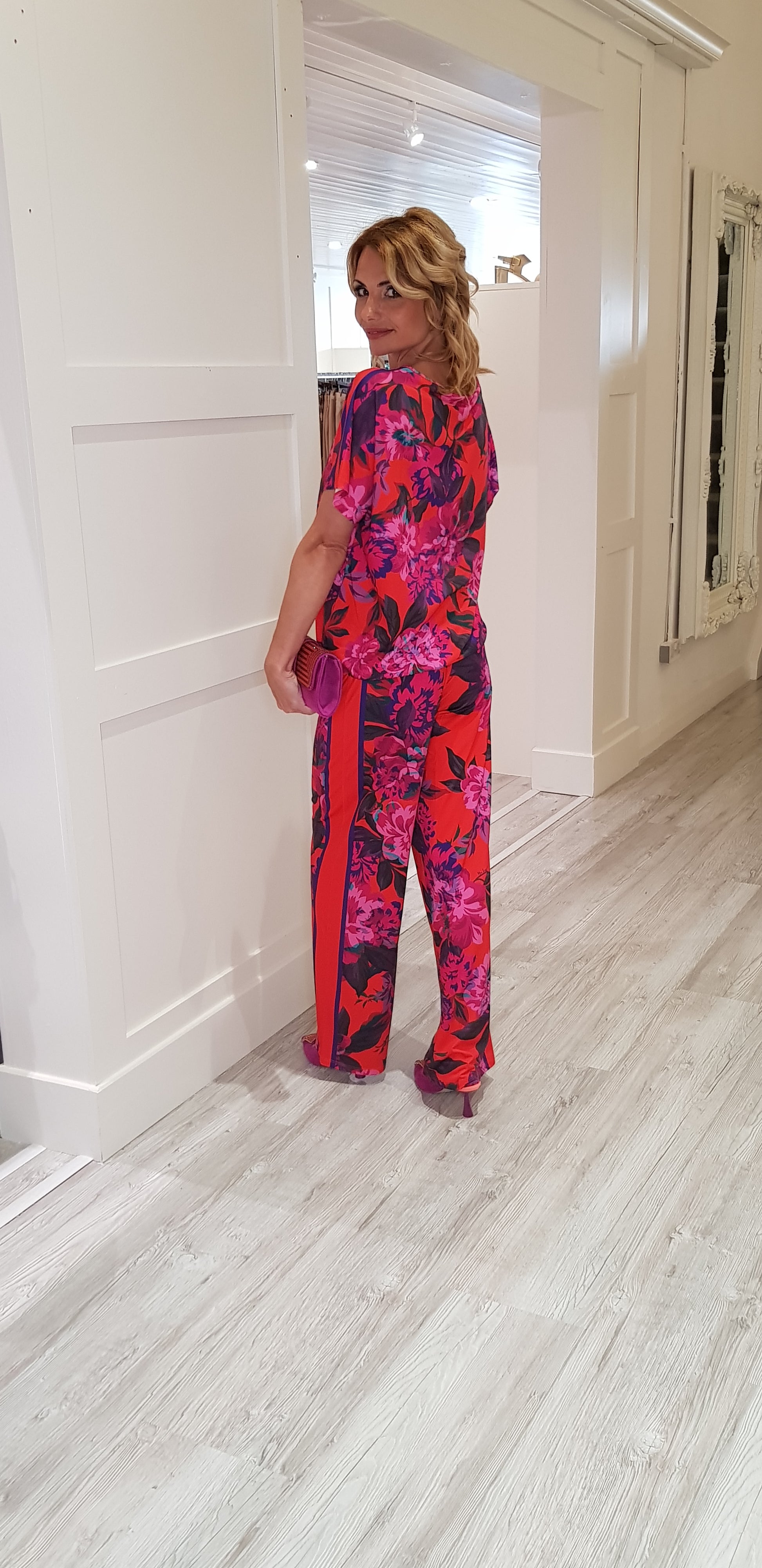 As a fashion expert, I highly recommend our Red And Pink Flower Top. With a round neck and short sleeves, this top offers a loose fit for comfort. The drawstring detail on the hemline adds a touch of style. Pair it with our matching trousers for a coordinated look.