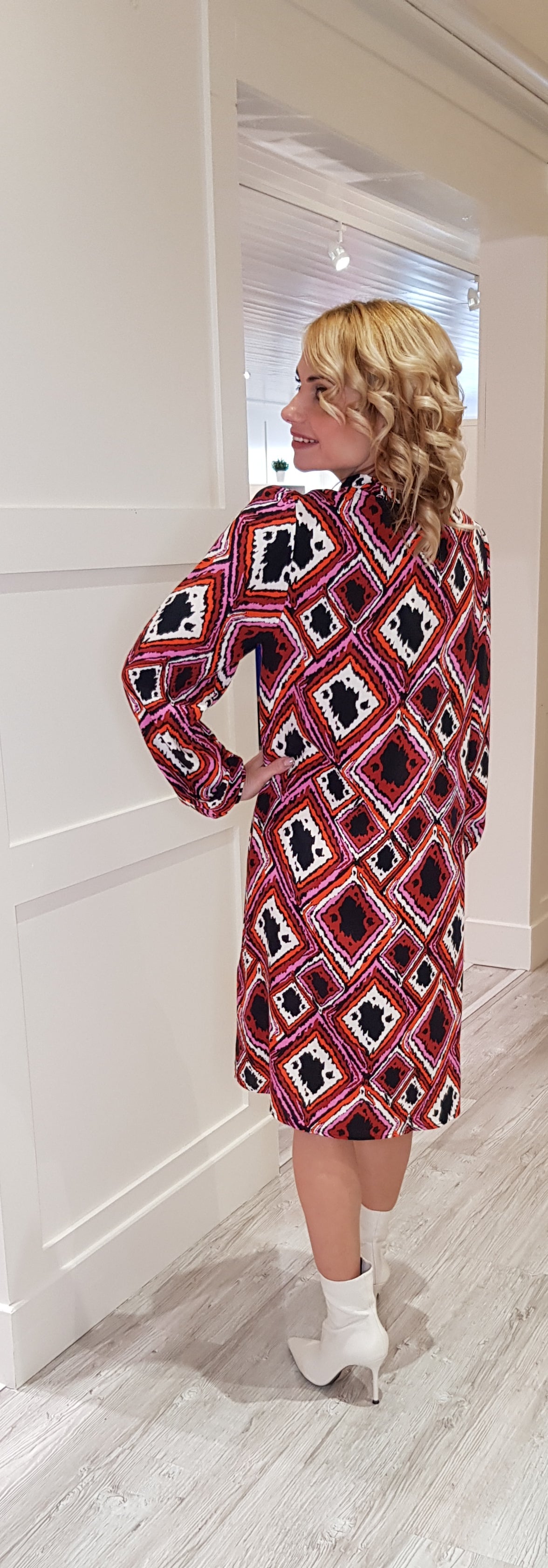 The flowing viscose dress with a graphic diamond print in red/black/pink can be worn summery with a denim jacket and sandals, but it also looks great with a chunky knit cardigan and booties.