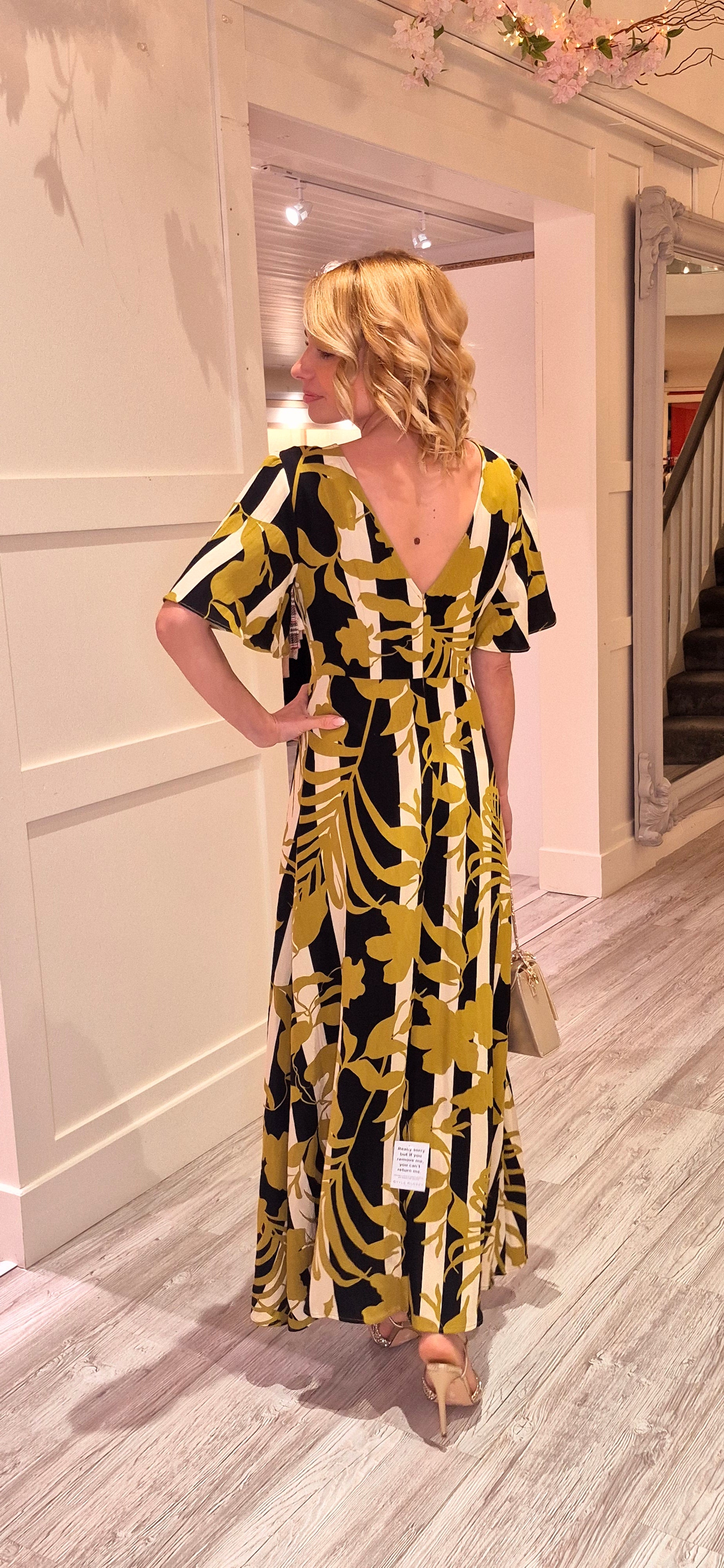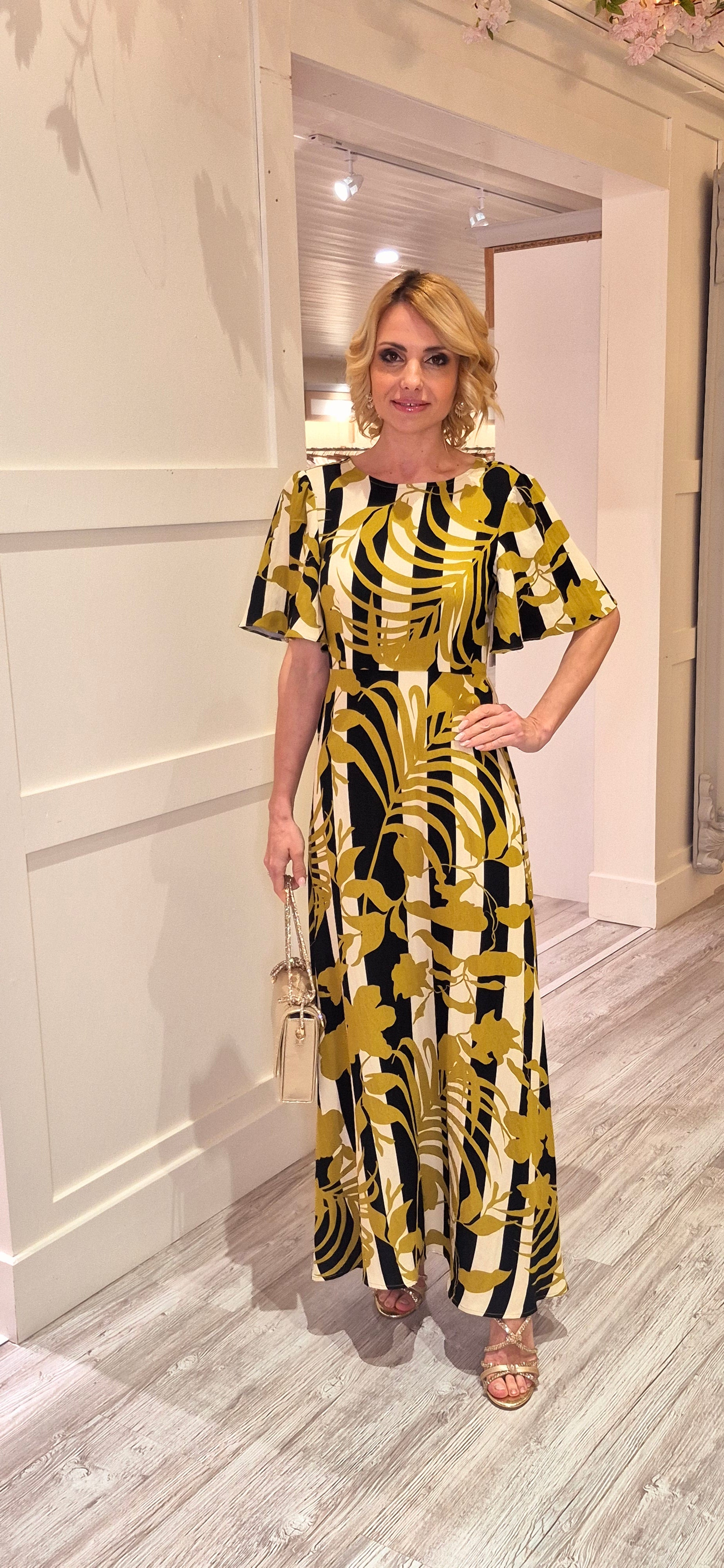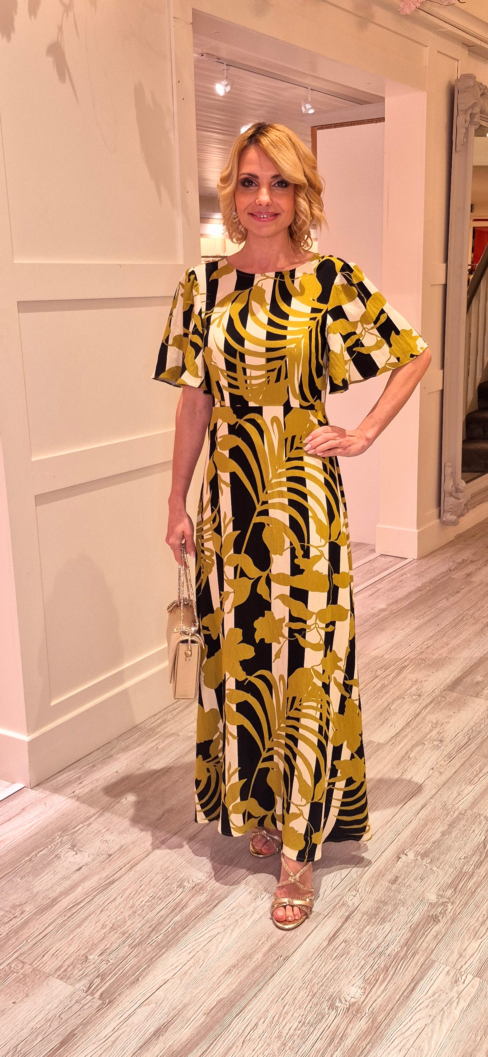 Experience effortless elegance with the Rene Olive Green Printed Dress. This a-line dress features a flattering round neck and a zip on the back for easy wear. The wide short sleeves provide comfort, while the lovely green and black pattern adds a touch of sophistication. Perfect for any occasion.