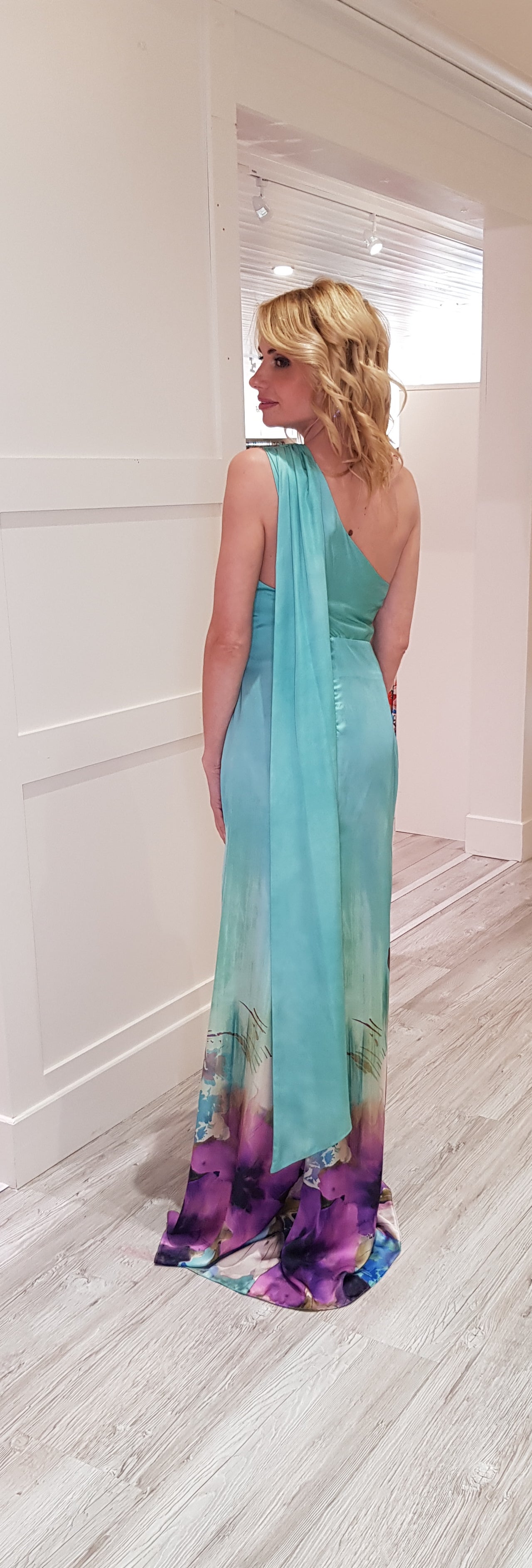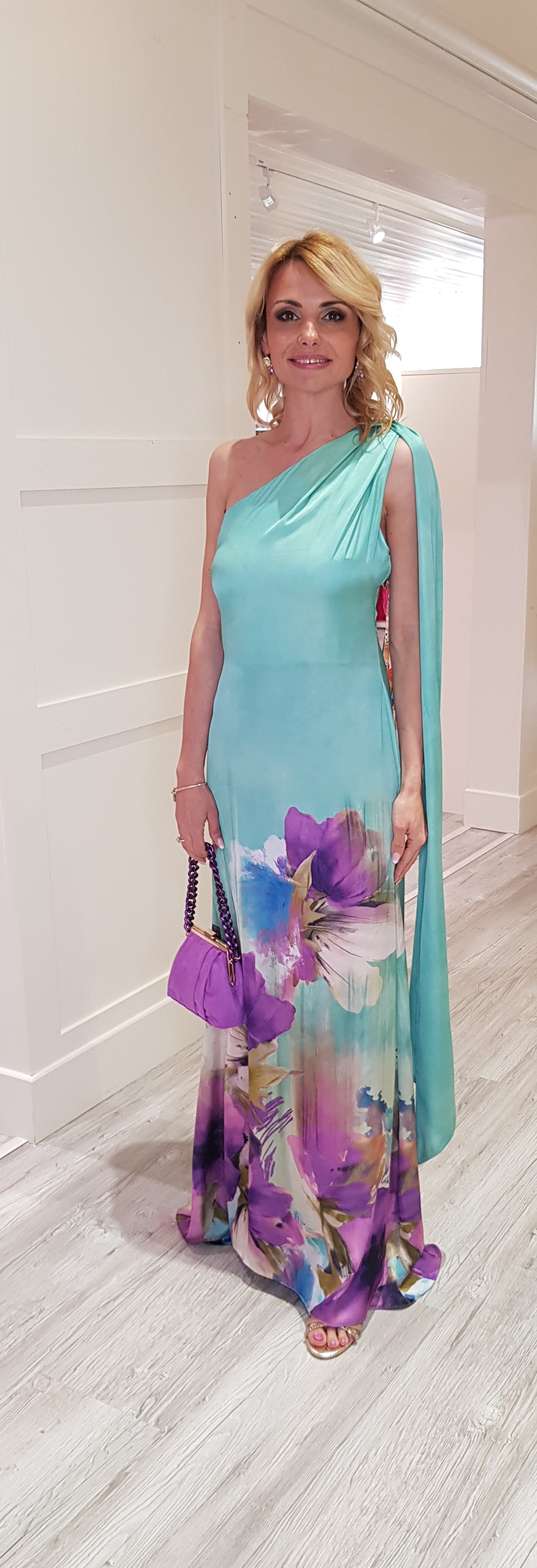 Elevate your wardrobe with our Sage Green Flower Maxi Dress. Featuring a one shoulder design with chic cape detailing, this dress exudes elegance. The satin look fabric is adorned with a lovely lilac flower print, making it a striking addition to any occasion. Fully lined for a comfortable fit.