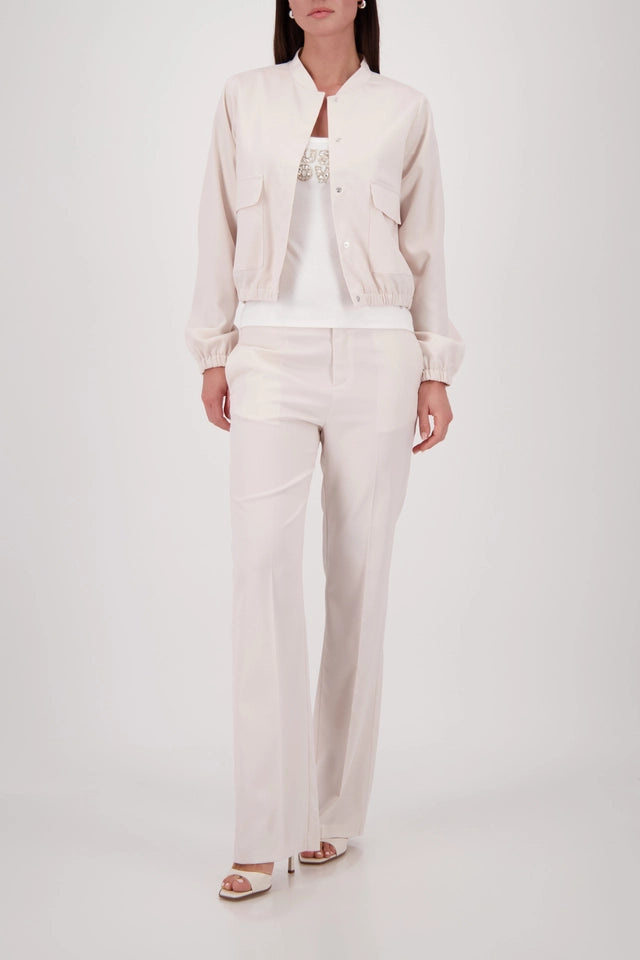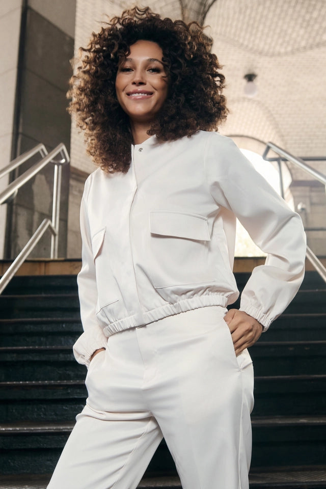 - This elegant satin cargo jacket combines a round neckline and practical flap pockets to create a stylish, modern outfit.