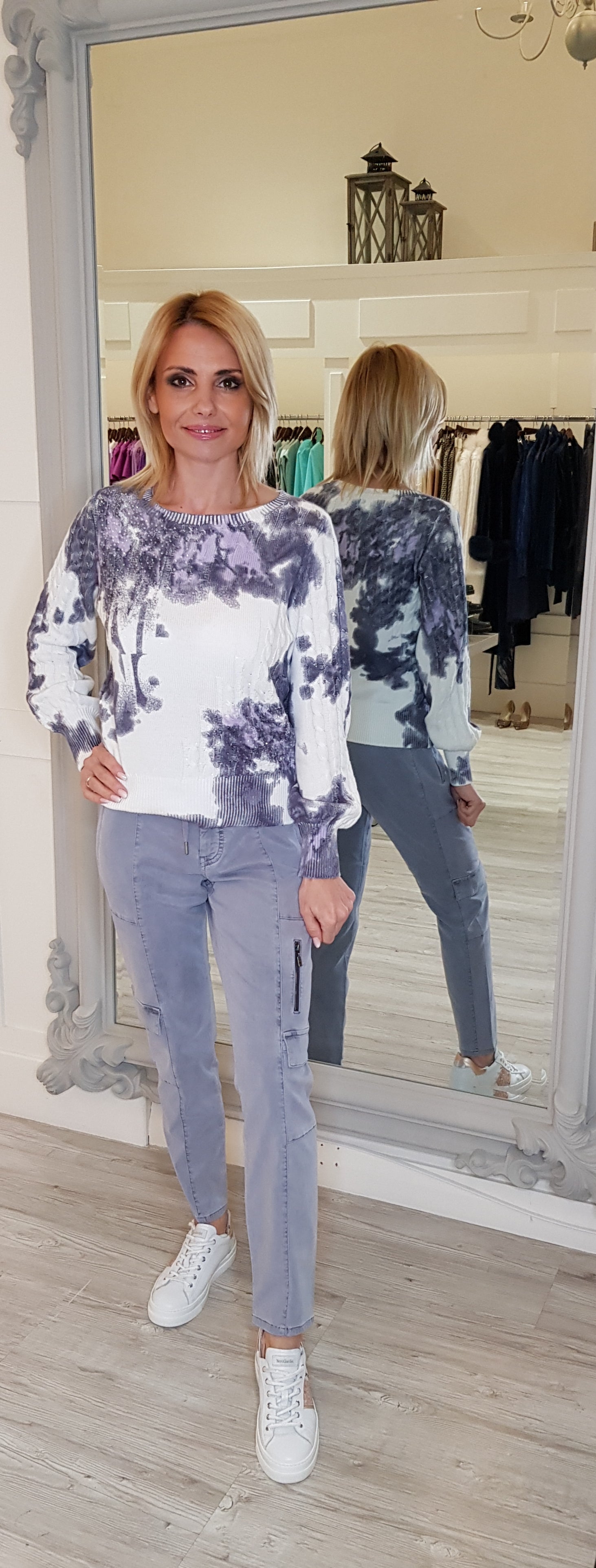 Experience warmth and style with our Smoked Purple Knit Jumper. This round neck jumper features long sleeves with elastic cuffs, and sparkly detailing on the front. Its lovely smoky pattern adds a touch of elegance to your wardrobe. Stay cozy and fashionable this season.