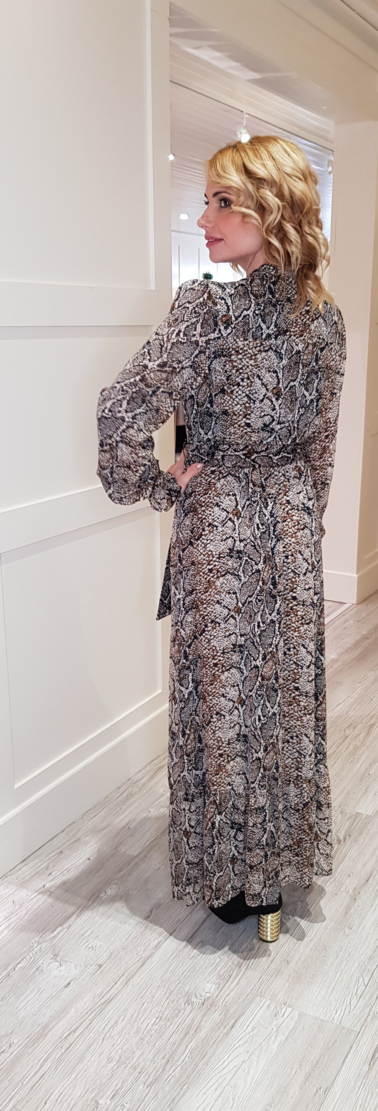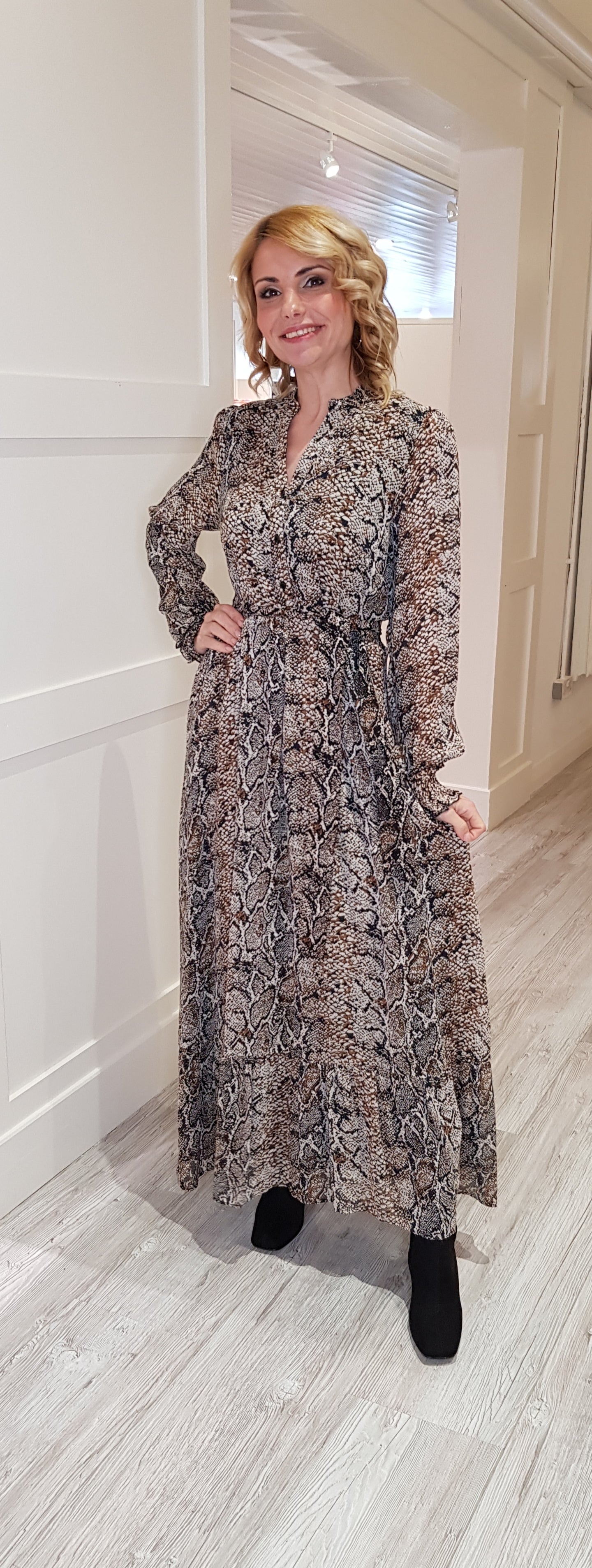 The flowing chiffon dress with modern snake print in typical black/brown/natural tones looks simply stunning. Style it with sandals and a straw bag in summer and with boots and a fur vest in autumn.