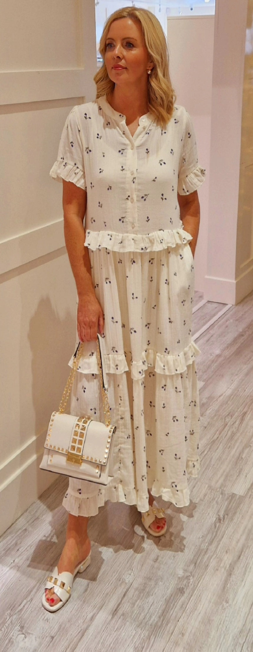 If you are looking for the perfect dress for both everyday and events, then look no further. Our suzie dress has a round neckline with a front placket opening down to the chest and short sleeves with cute small frills. The dress cuts at the waist and is in maxi length. The skirt consists of three panels. The dress fits normal and should be a bit loose fitted.