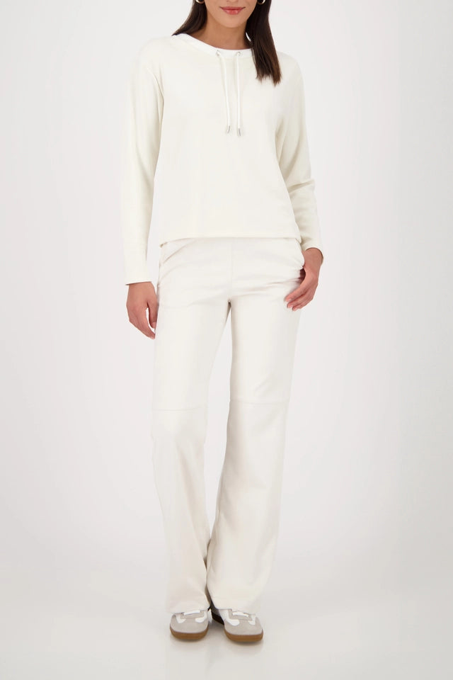 This sweatshirt combines softness and comfort with a stretchy modal blend fabric. Featuring a round neckline and slightly dropped shoulders, it offers a relaxed fit with long sleeves. The drawstring adds adjustable detail, complemented by a subtle jewellery accent for a refined touch. Designed for ease and style, it suits everyday wear while maintaining a sophisticated look. The model is 1.76 m tall, wearing size 36; size 38 measures 60 cm in length.