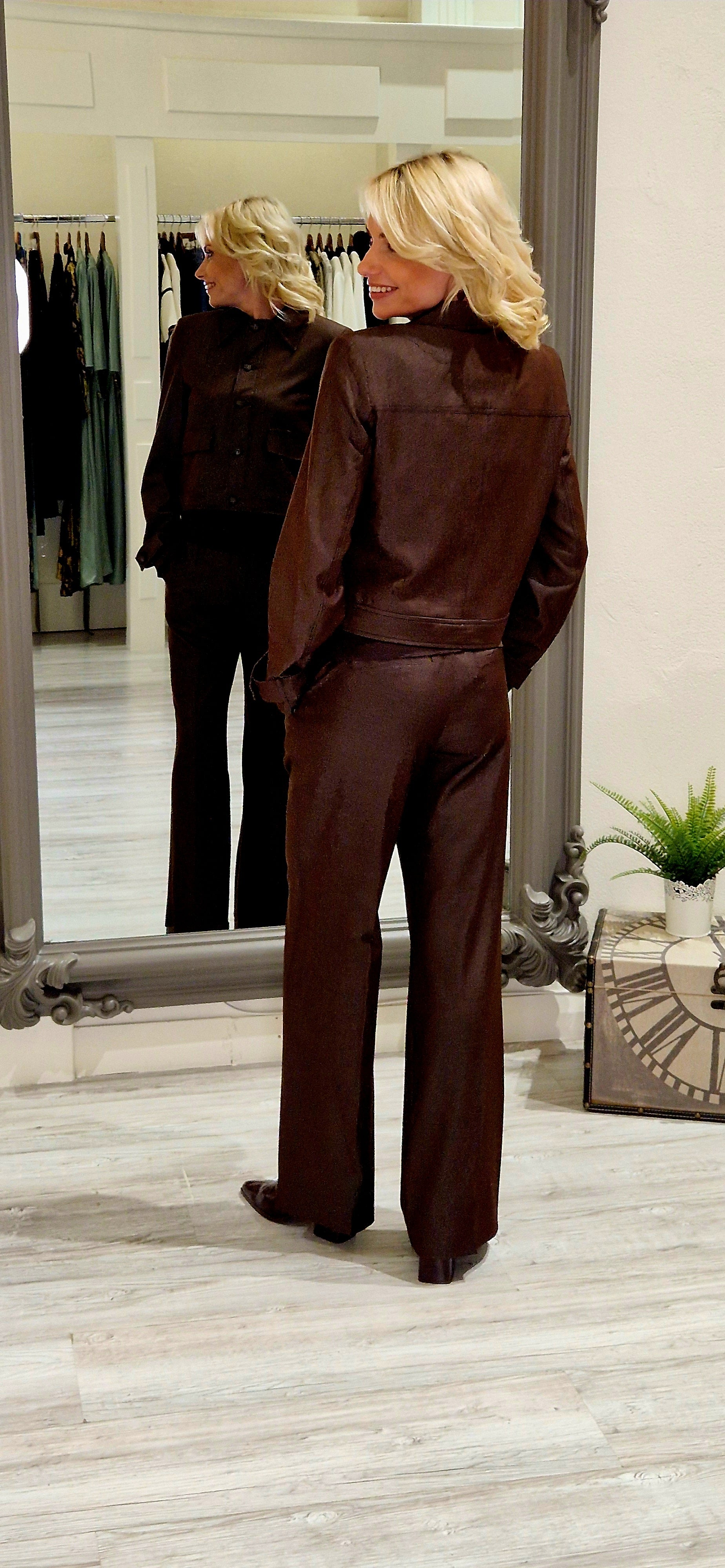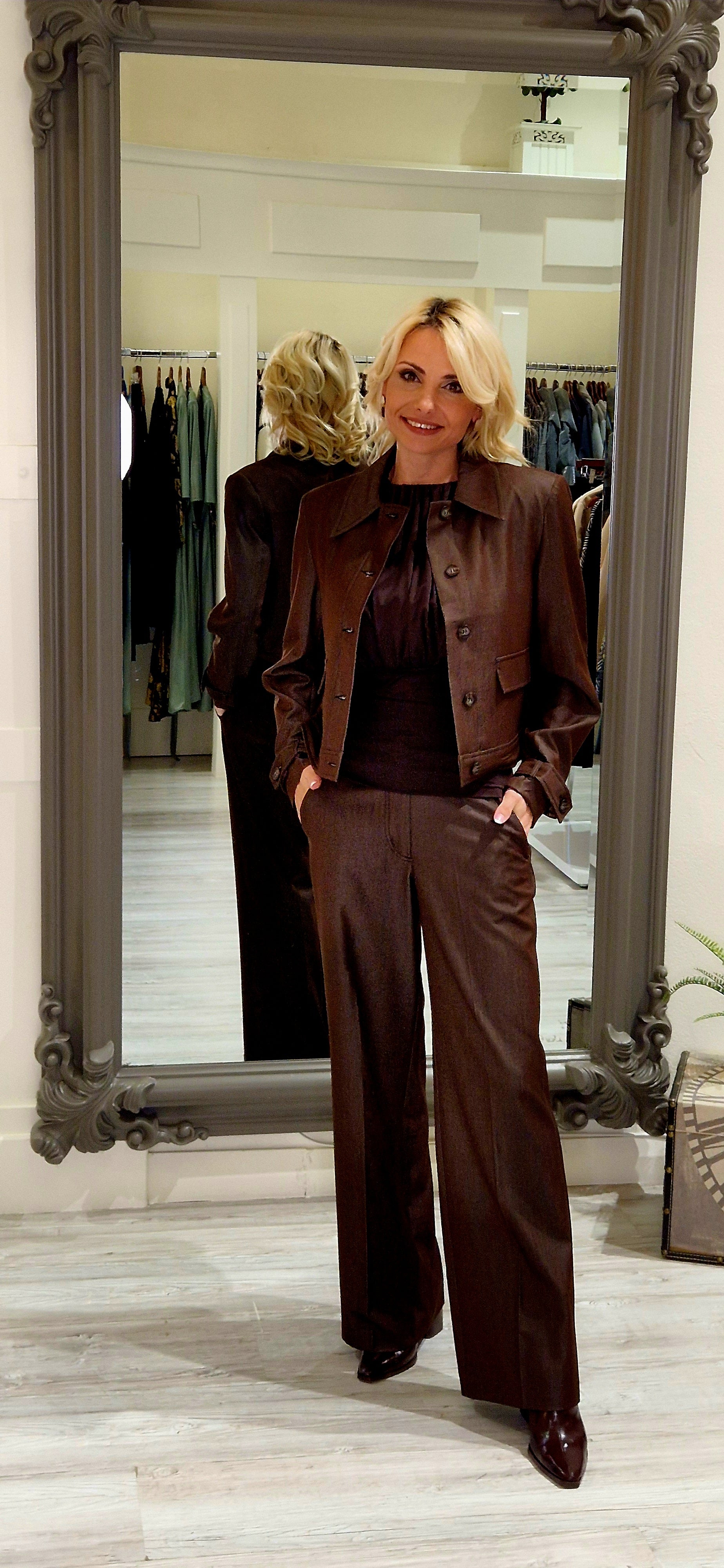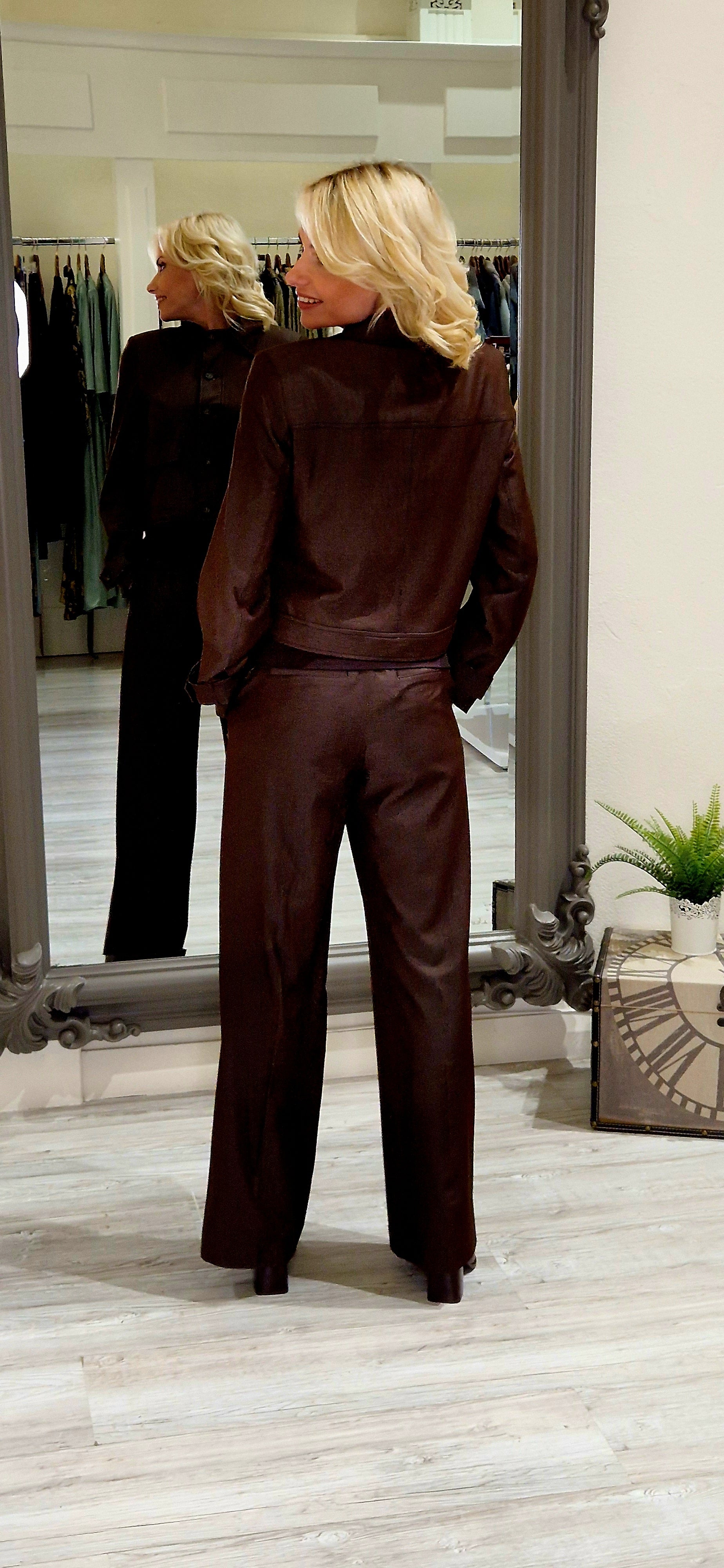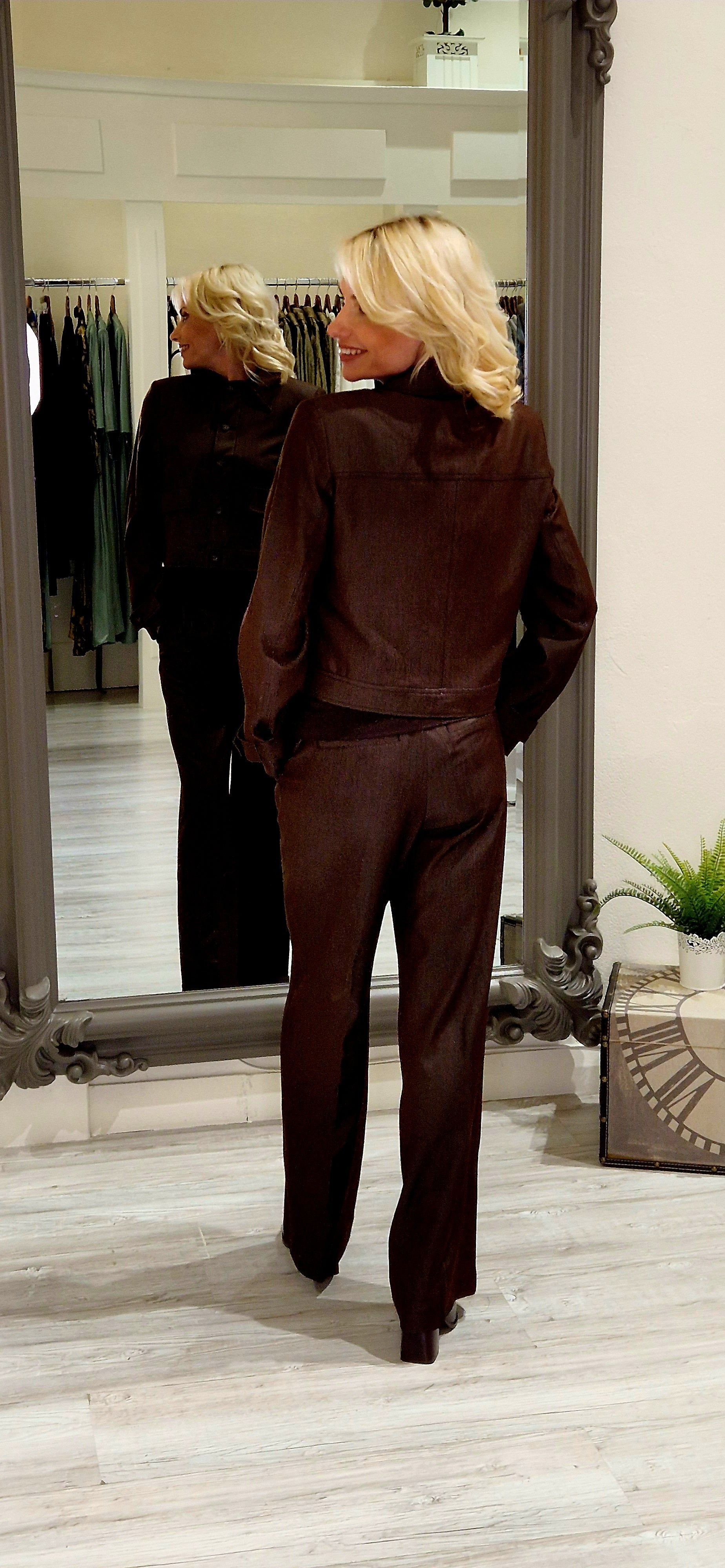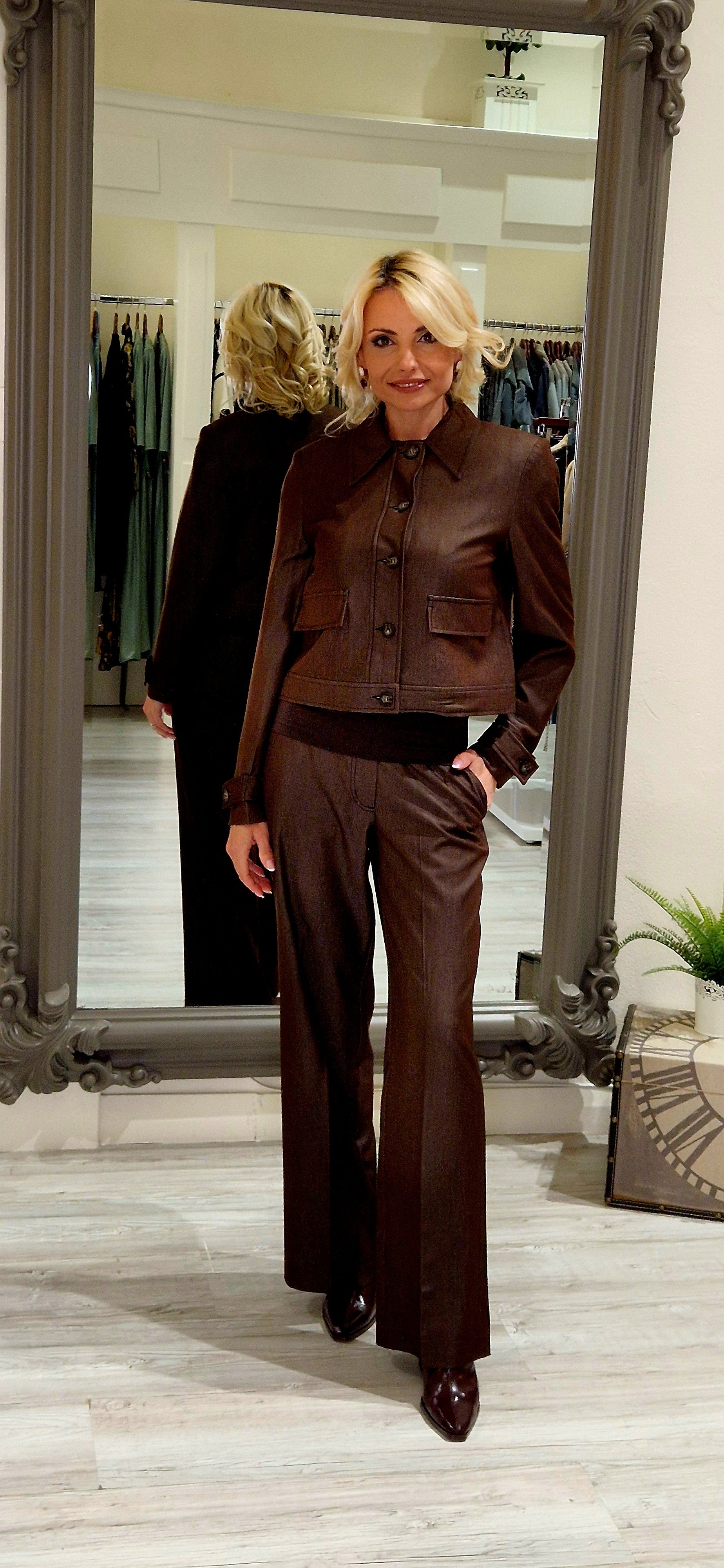 The Terry Brown Denim Jacket combines timeless style with practical versatility. Crafted from a durable blend of 70% polyester and 25% cotton, this piece offers excellent durability and easy care—simply wash at 40 degrees for optimal longevity. Long sleeves and front button closure provide a classic silhouette that works effortlessly across seasons. Coordinate with the matching trousers, top, and coat to create a cohesive wardrobe collection. An essential layering piece for those seeking quality construction and enduring appeal.