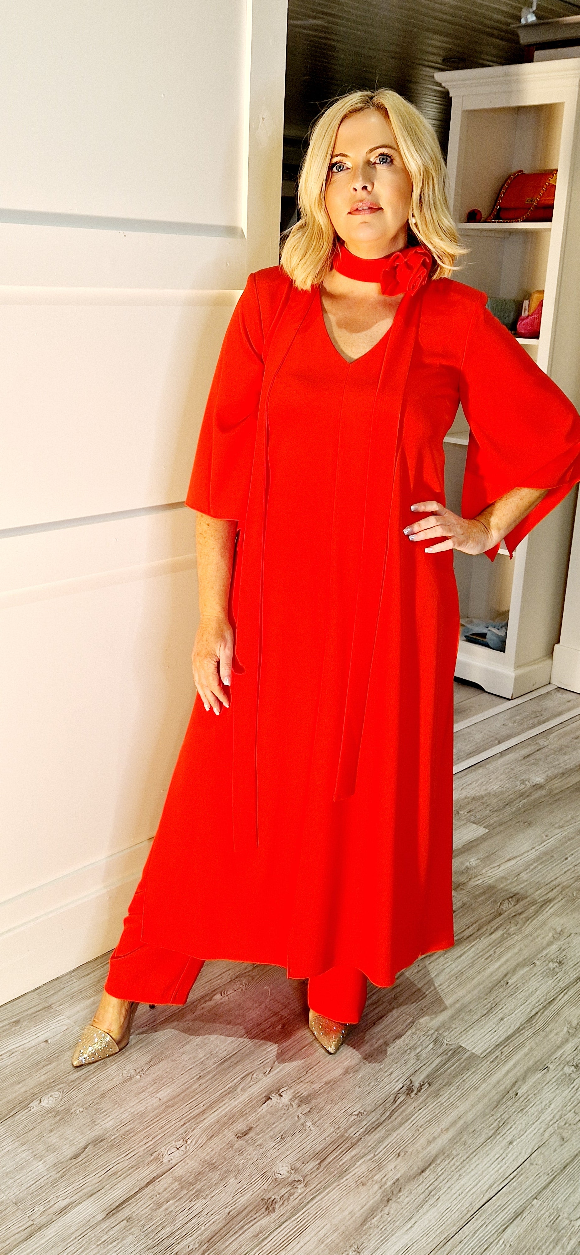 Two Piece Red Co-Ord is designed with a delicate V-neck and 3/4 sleeves with slits for a stylish touch. The palazzo trousers feature a zip closure on the side, and the detachable belt with flower detail adds an elegant touch. Made with 97% polyester and 3% spandex for comfort and easy care.