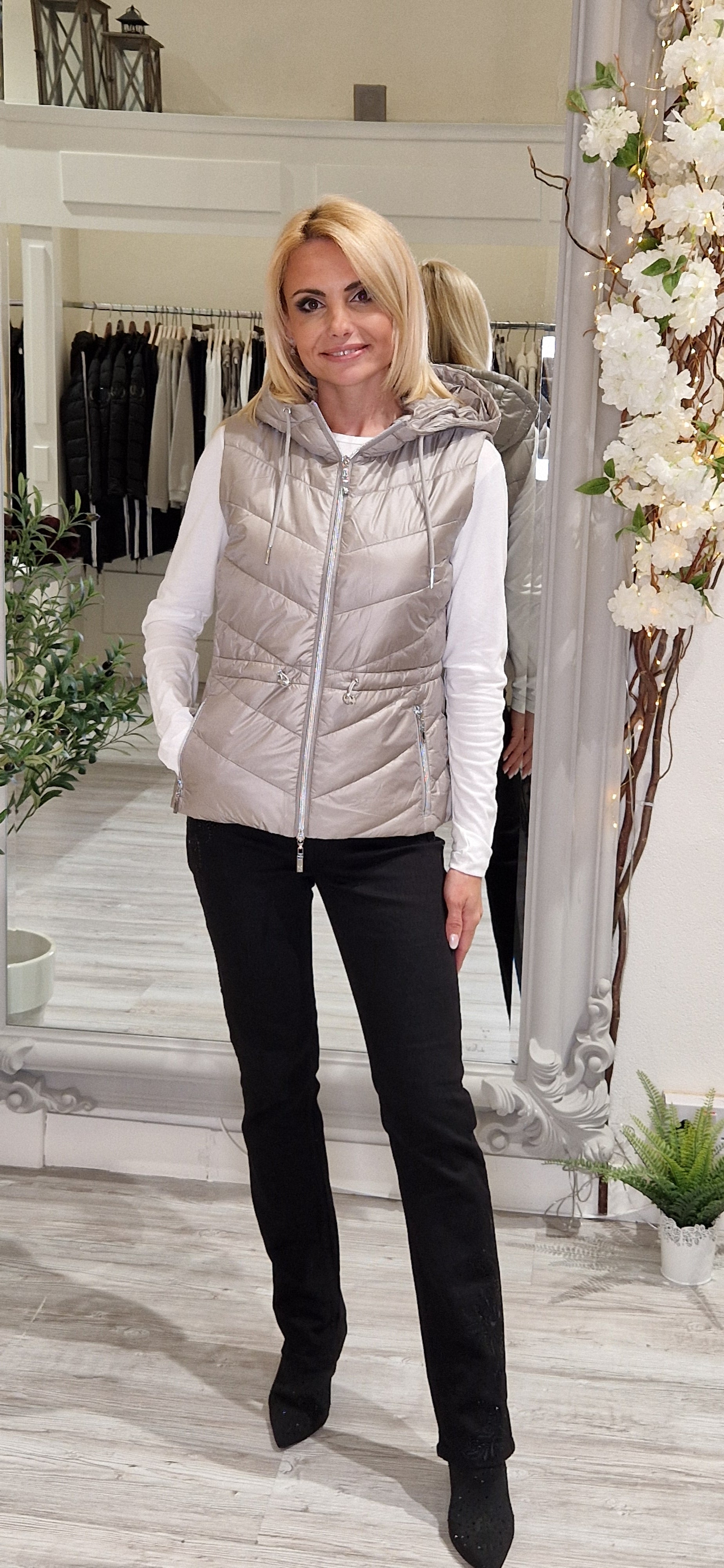 This Greige Waistcoat with Hood combines practical design with comfort, featuring a front zip closure and side pockets for convenient storage. Crafted from 100% polyamide, it offers durability and easy care, requiring only a 30-degree wash. Pair it effortlessly with our matching tops and trousers for a coordinated and polished look.