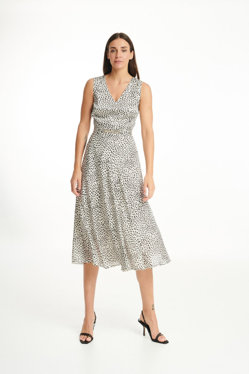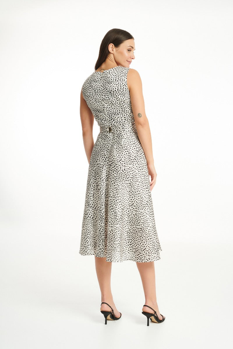 Expertly crafted with a V-neck and a flattering, flowing skirt, this White And Black Polka Dot Midi Dress is perfect for any occasion. The matching belt, adorned with a gold circle, adds a touch of elegance while the back zip ensures a comfortable fit. Stay stylish and chic with its lovely polka dot print.