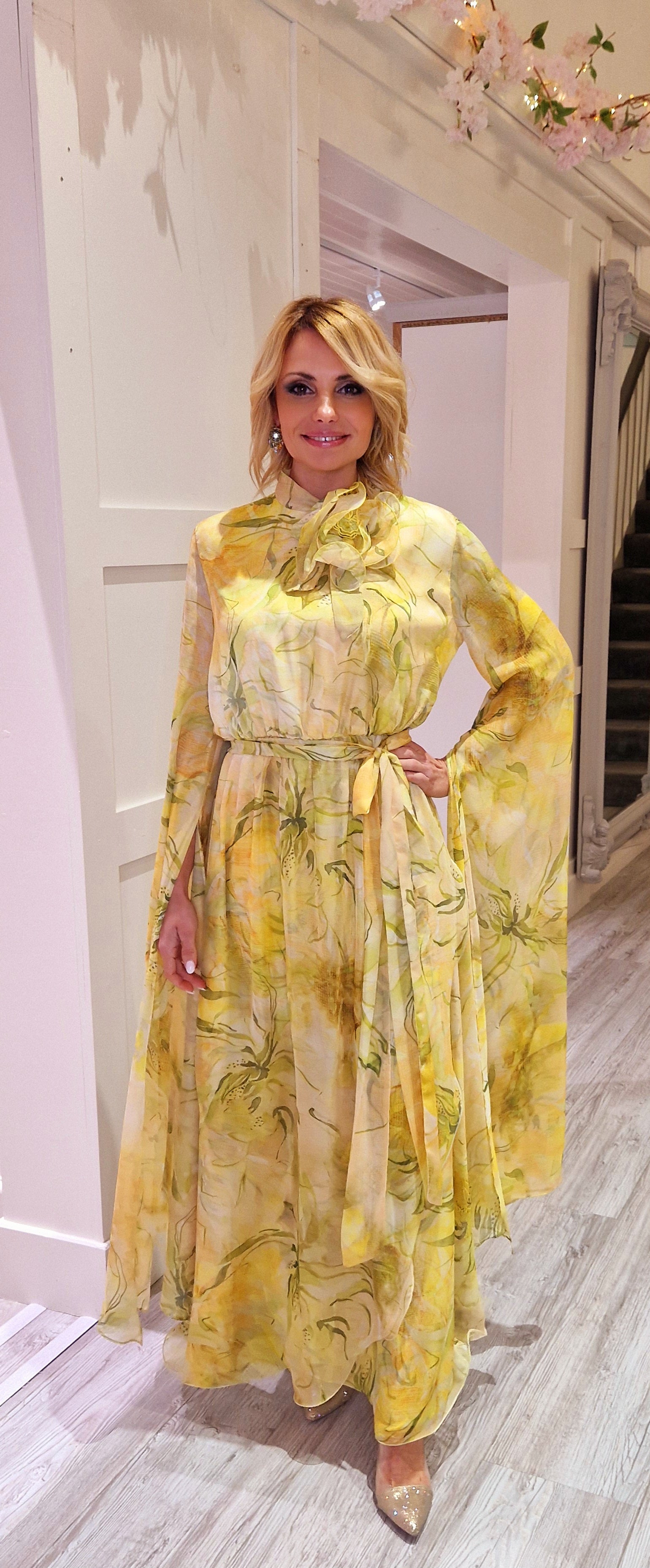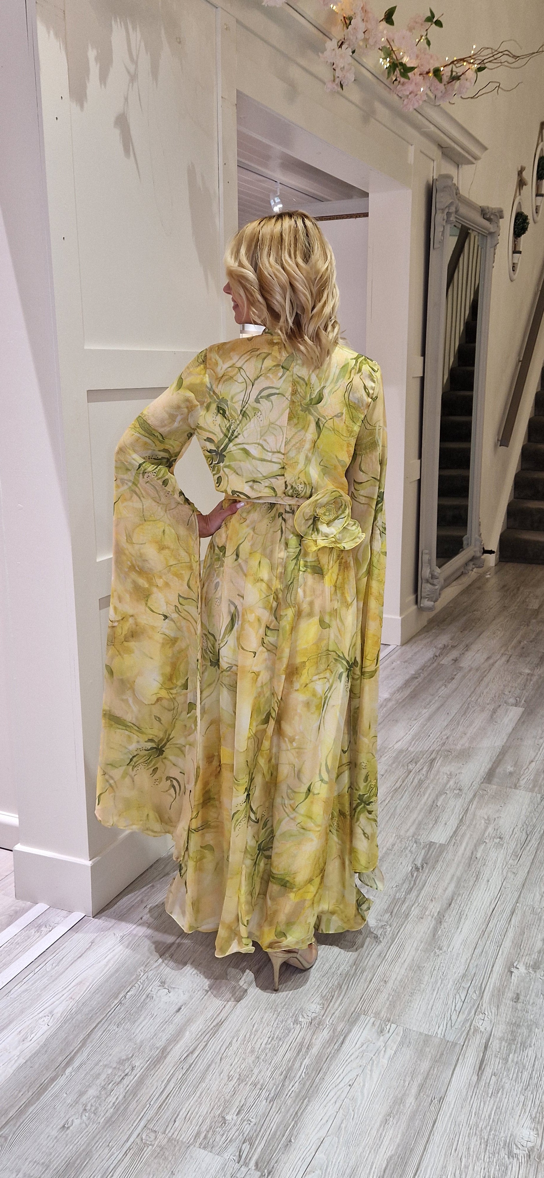 Expertly crafted from 100% polyester, this Yellow and Green Chiffon Dress features a high neck, long frilly sleeves, and an elastic waist for a comfortable and flattering fit. The detachable flower brooch adds a touch of elegance to this versatile dress. Machine washable at 30 degrees for easy care.